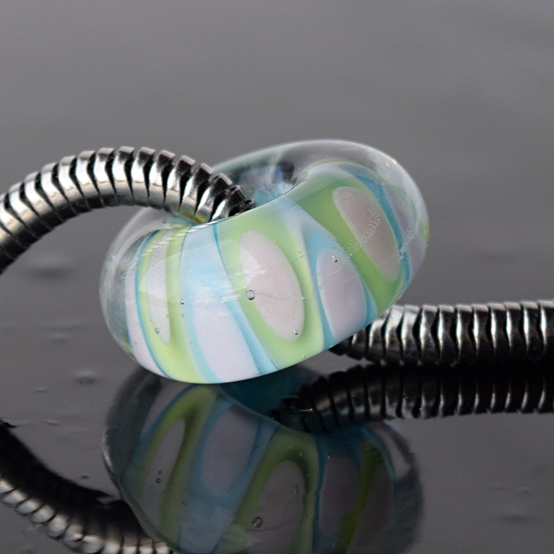 Ručně vyrobená vinutá perle pro náramky z italského skla v mých oblíbených barvách modré a zelené a trochou růžové. Díky průvleku 5 mm si ji snadno navléknete na náramek a nebo třeba na řetízek na krk 🙂