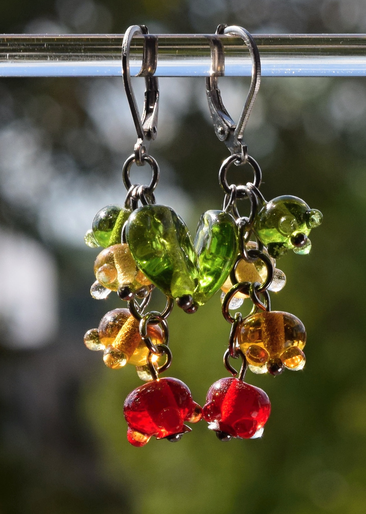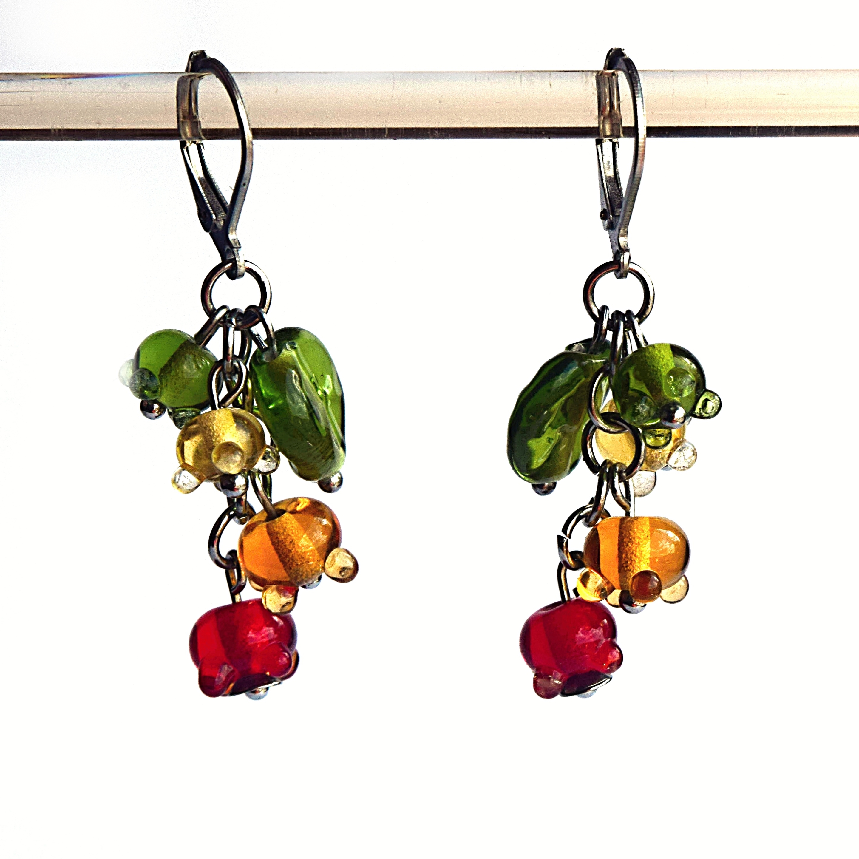 Vinuté perličky vyrábím ručně na sklářském kahanu, na tyto jsem použila české lampové sklo a ve výběru barev jsem se nechala inspirovat podzimem Zapínání a ostatní kovové části jsou z chirurgické nerezové oceli – jsou tedy vhodné i pro alergiky. Délka náušnice se zapínáním francouzského typu je cca 4,6 cm.