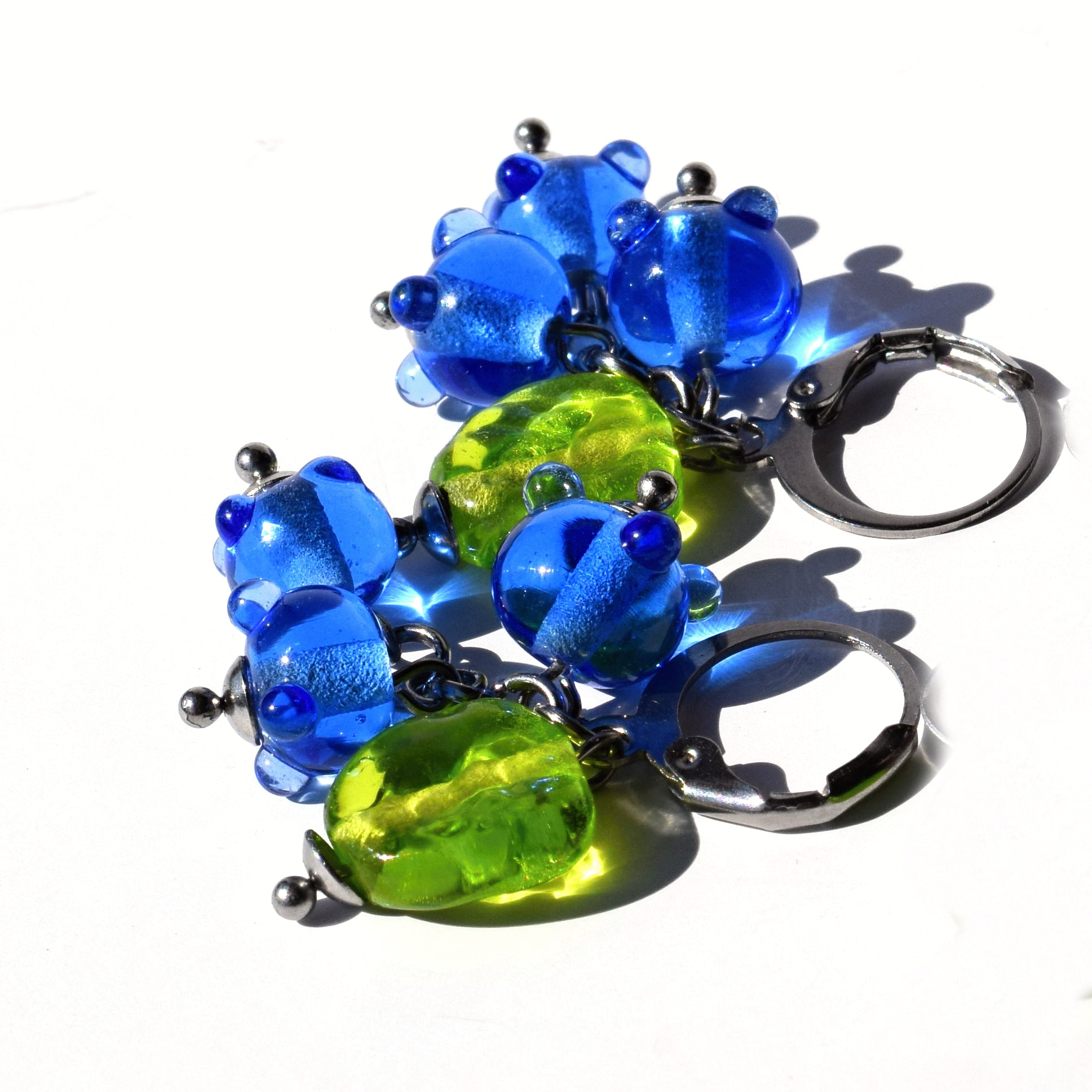 Vinuté perličky vyrábím ručně na sklářském kahanu, na tyto jsem použila italské modré a světle zelené sklo. Zapínání a ostatní kovové části jsou z chirurgické nerezové oceli – jsou tedy vhodné i pro alergiky. Délka náušnice se zapínáním francouzského typu je cca 3,5 cm.