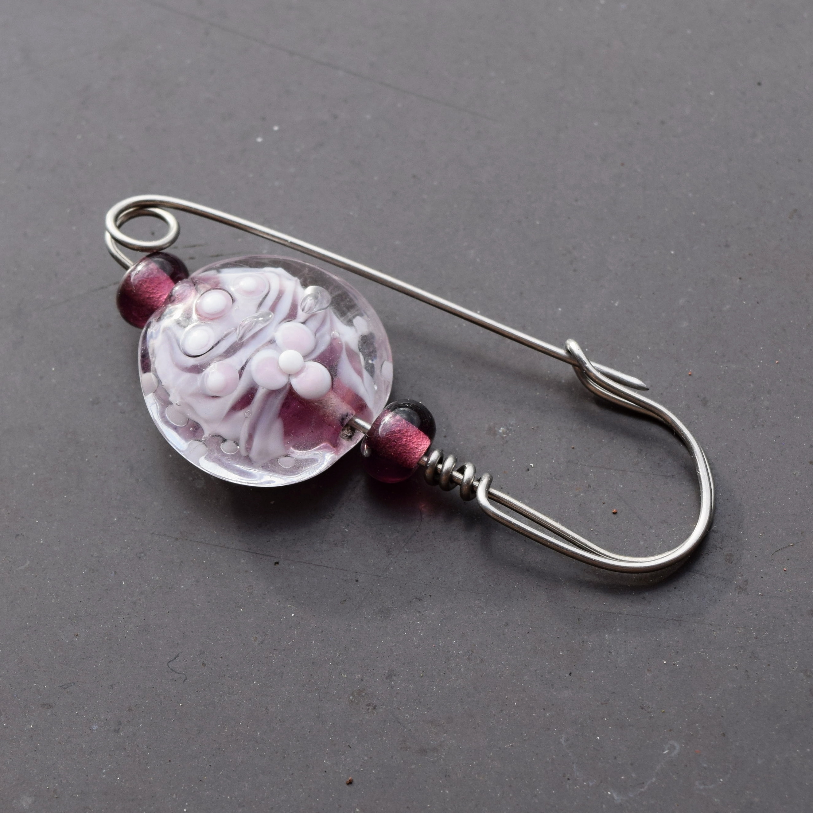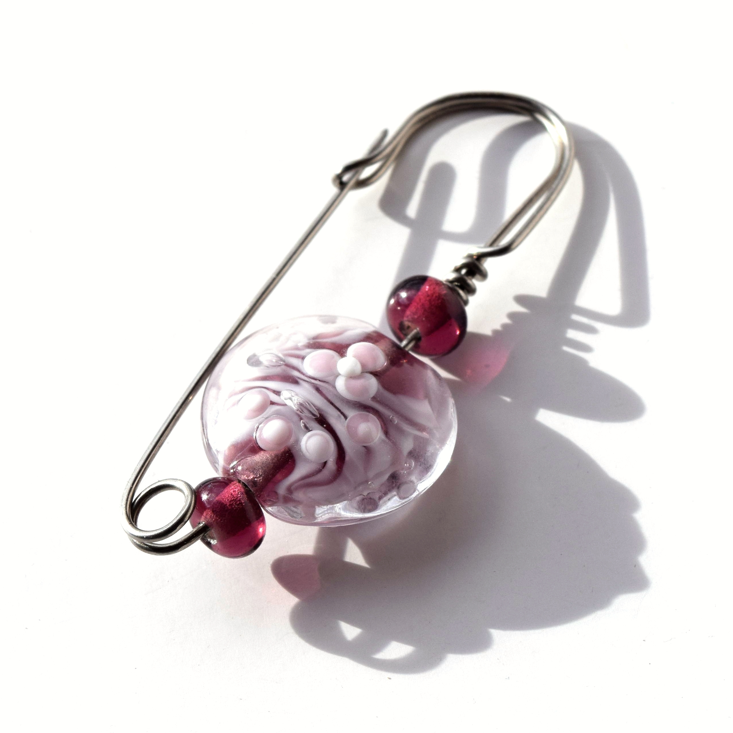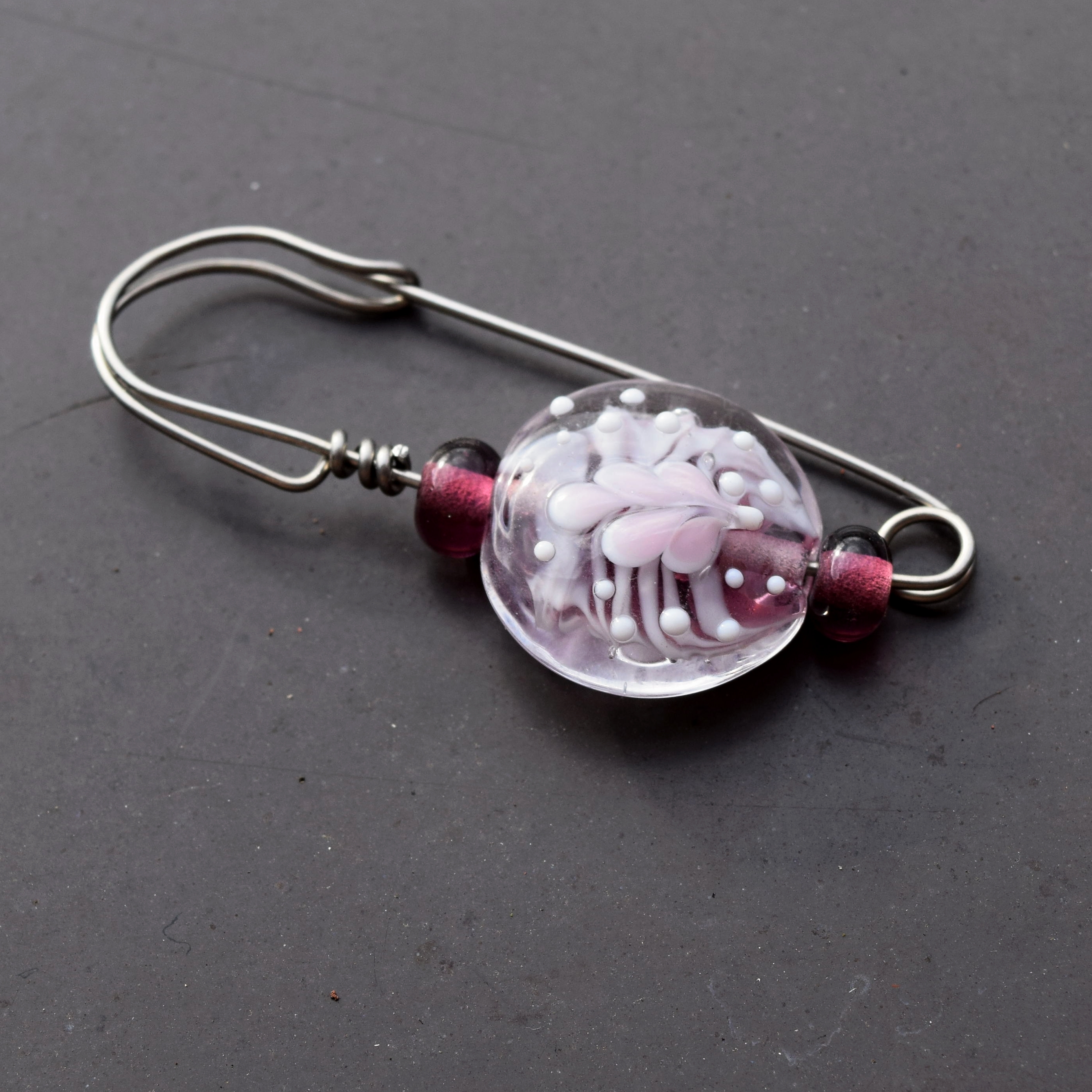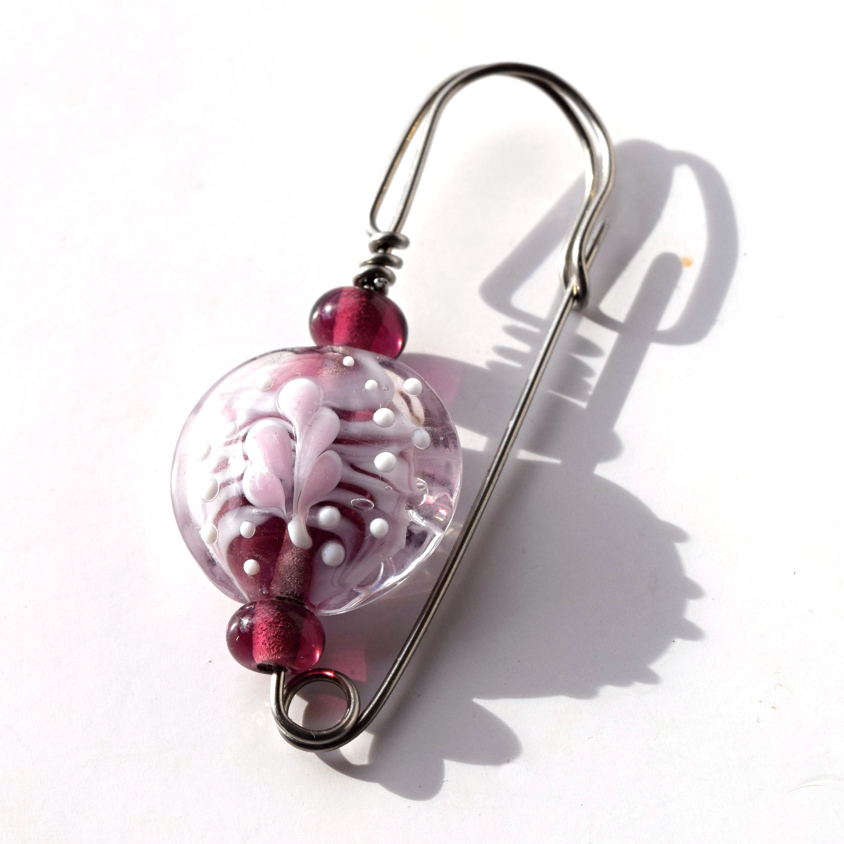 Na brož jsem použila svou autorskou vinutou perlu a nerezový drát, takže se nemusíte bát, že by zbarvil oblečení. Špendlíkem nepropichujte hustou tkaninu, jako například kabát, nebo softshelovou bundu, dírky, které by v ní udělal by nezmizely. Ale můžete ho použít na pletené svetry, tkané šály a kdekoli Vás napadne.