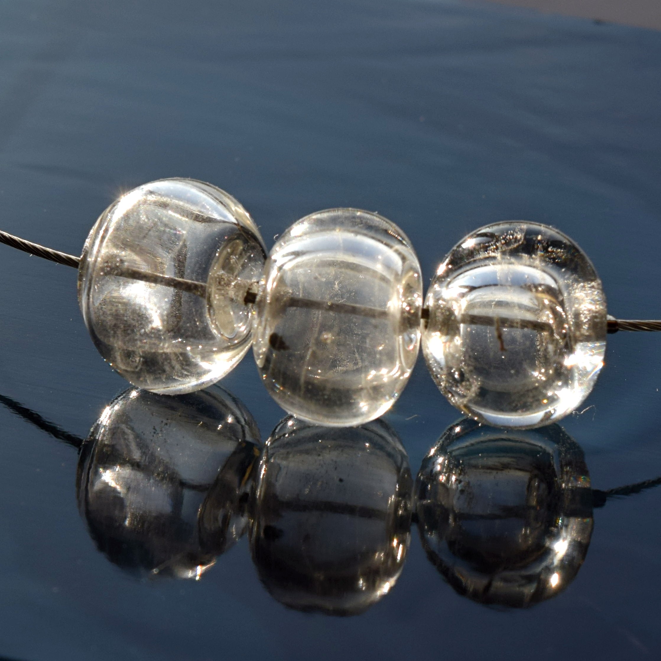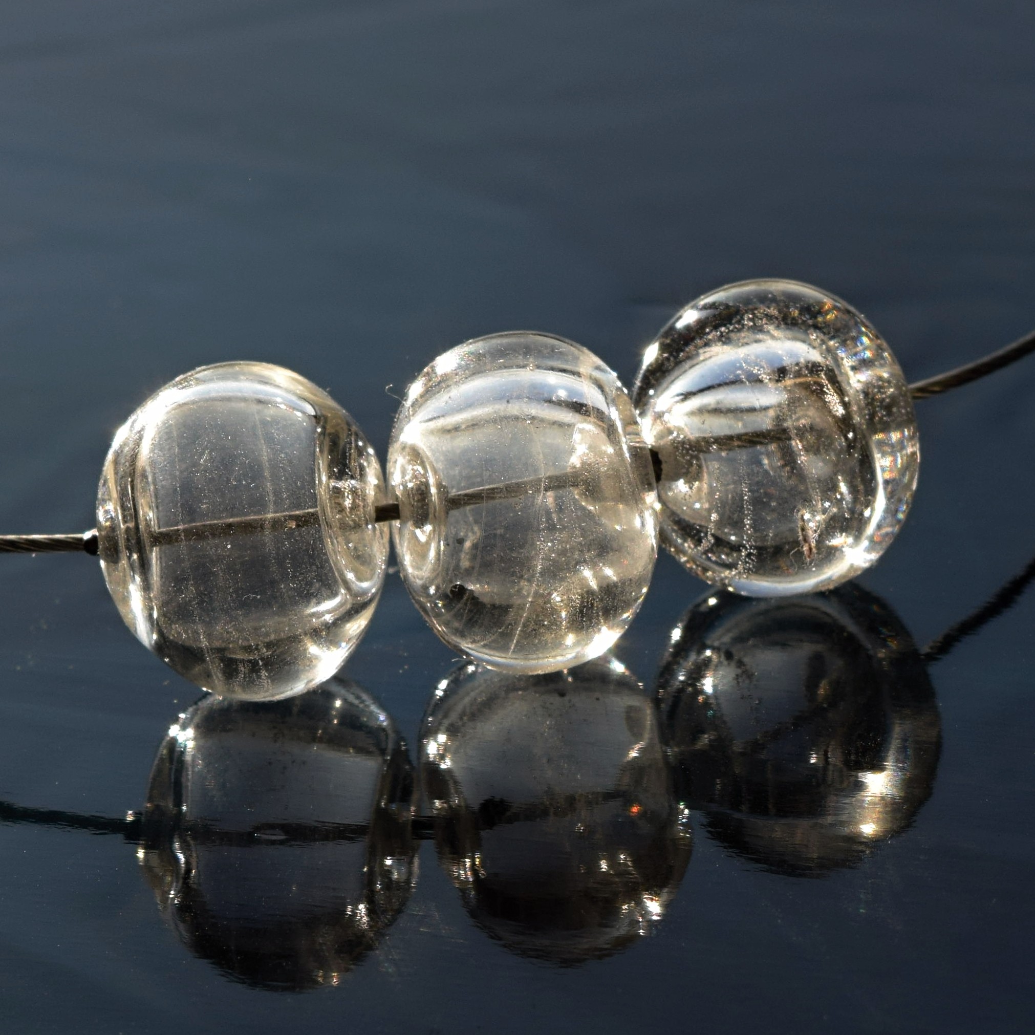 Vinuté korálky jsou vyrobené ručně v plameni sklářského kahanu technikou vinutého skla a navlečené na bižuterní obruči s nerezovým zapínáním na karabinku.