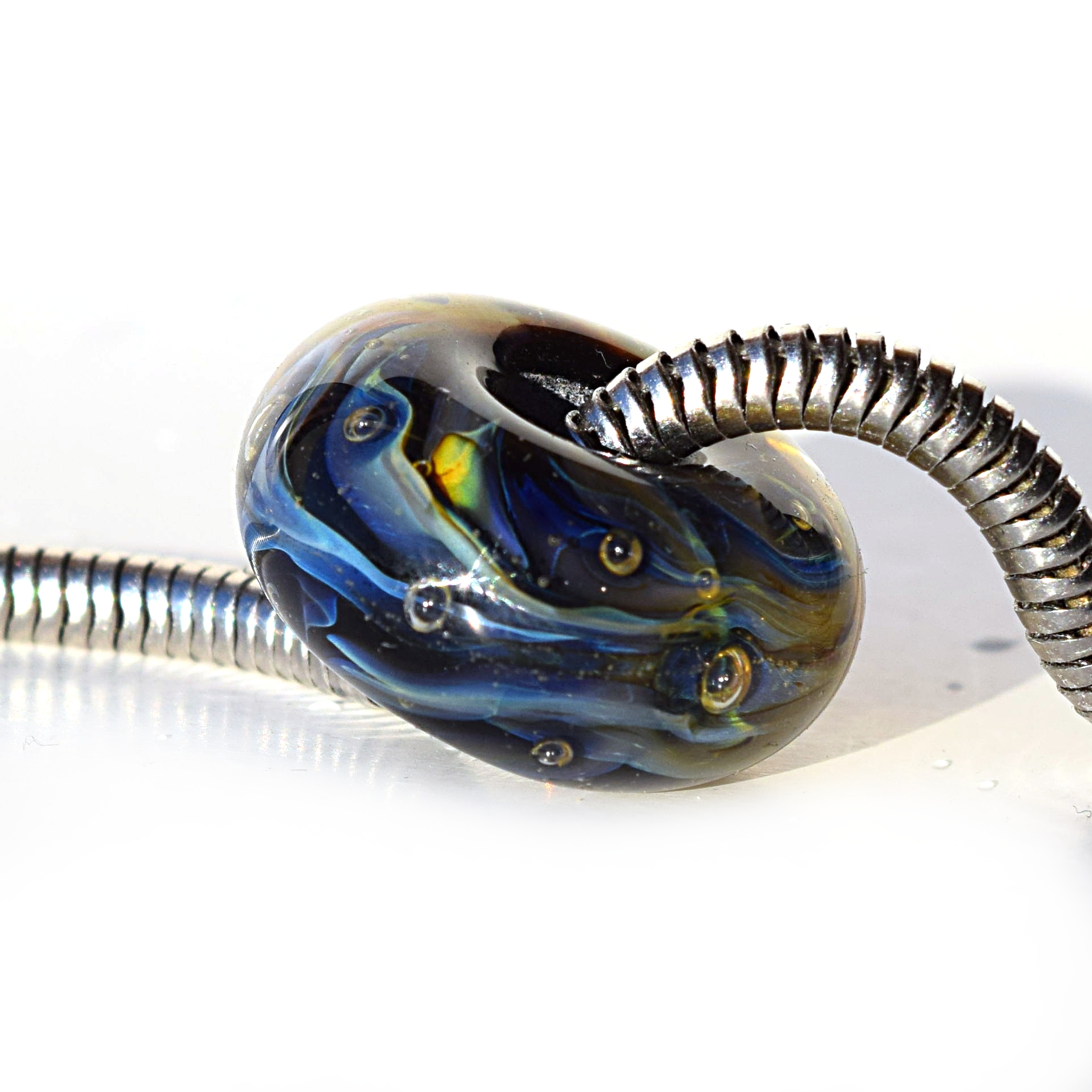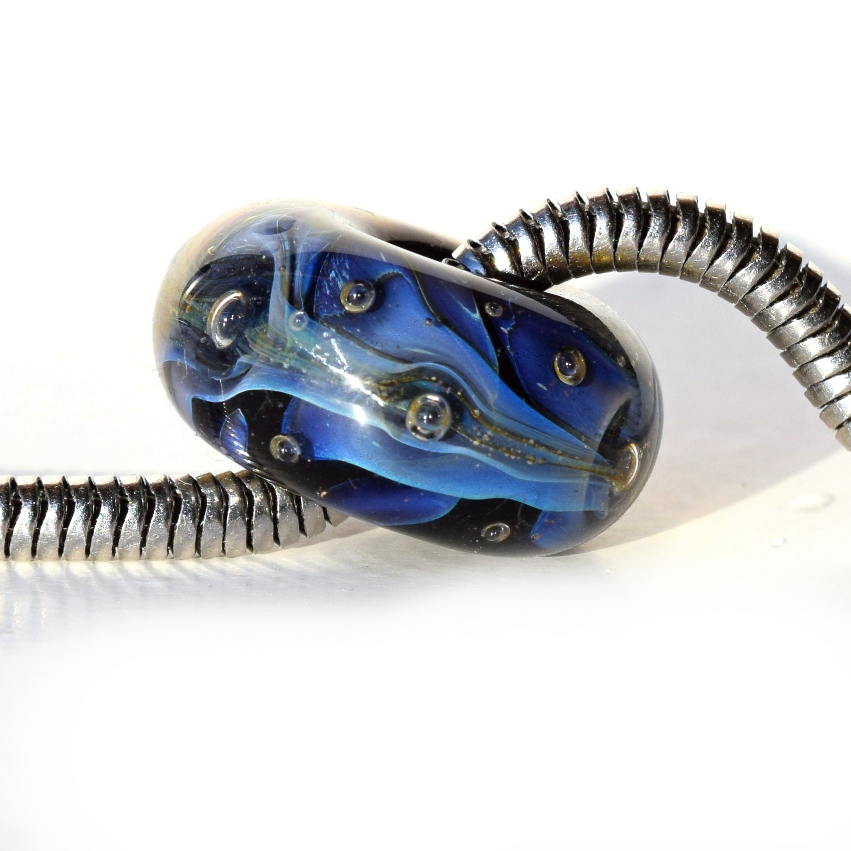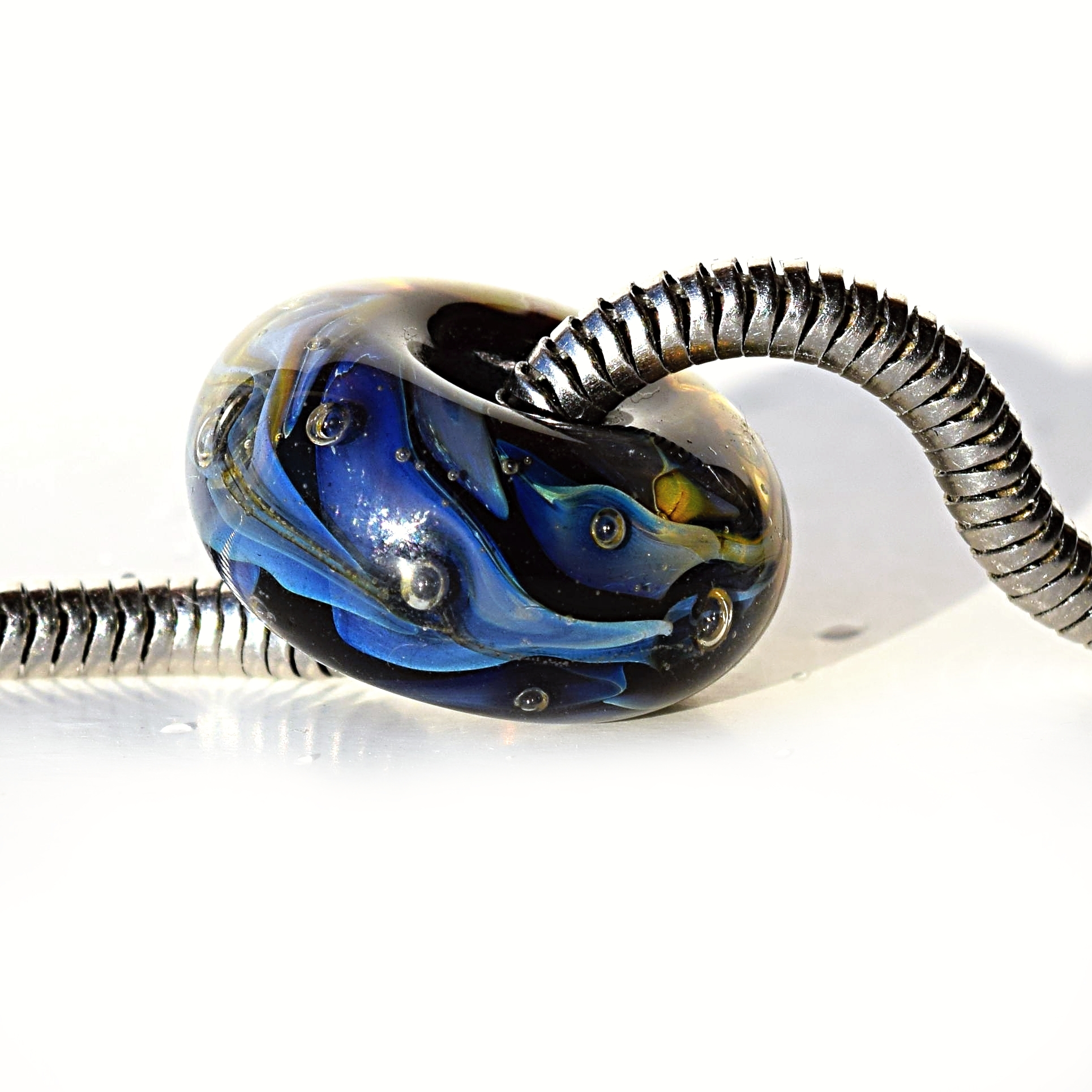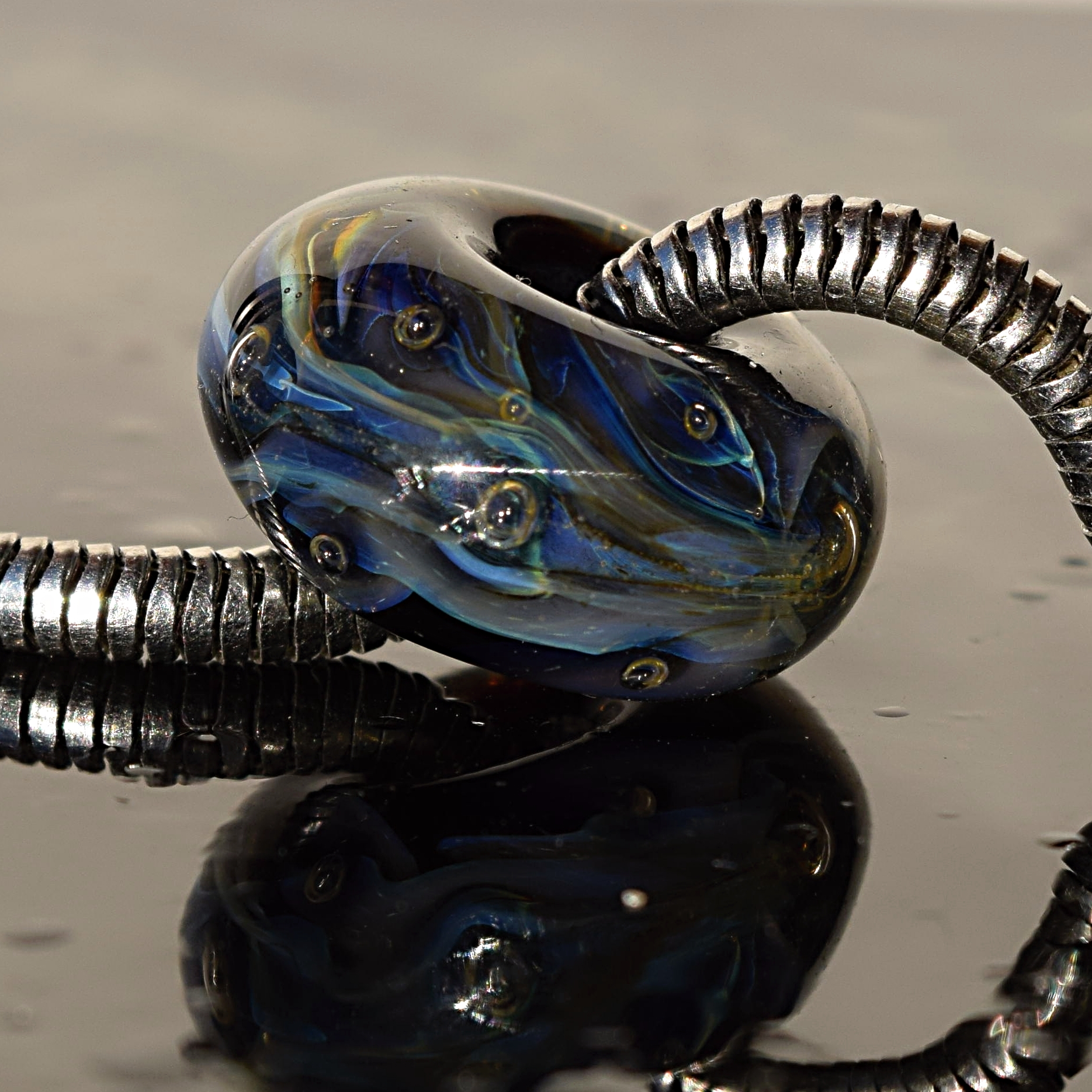 Autorská vinuté perle z duhového skla, modrá přechází do zelenkavých tónů, pokud do skla zasvítí sluníčko, objeví se i oranžovo- červené odlesky.
