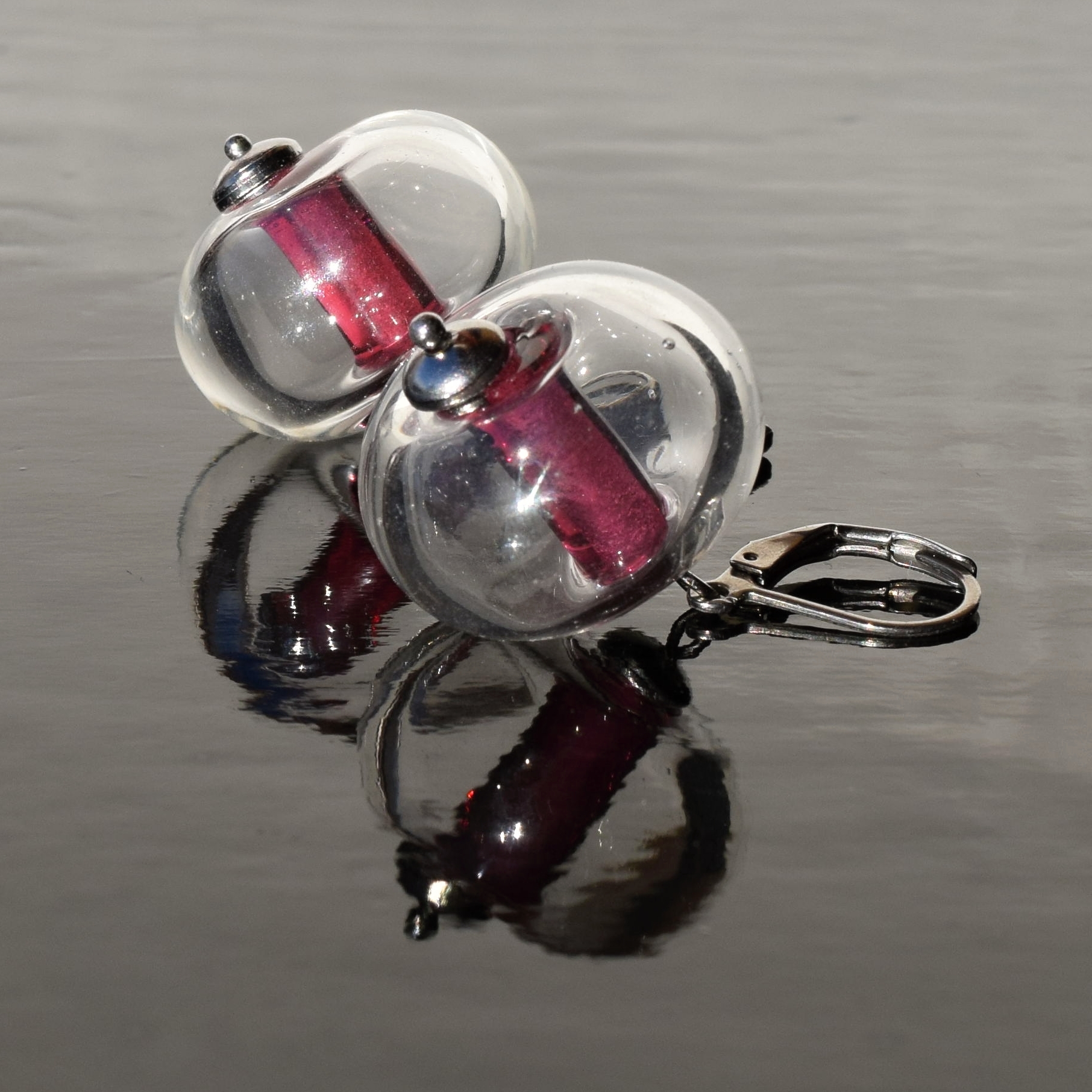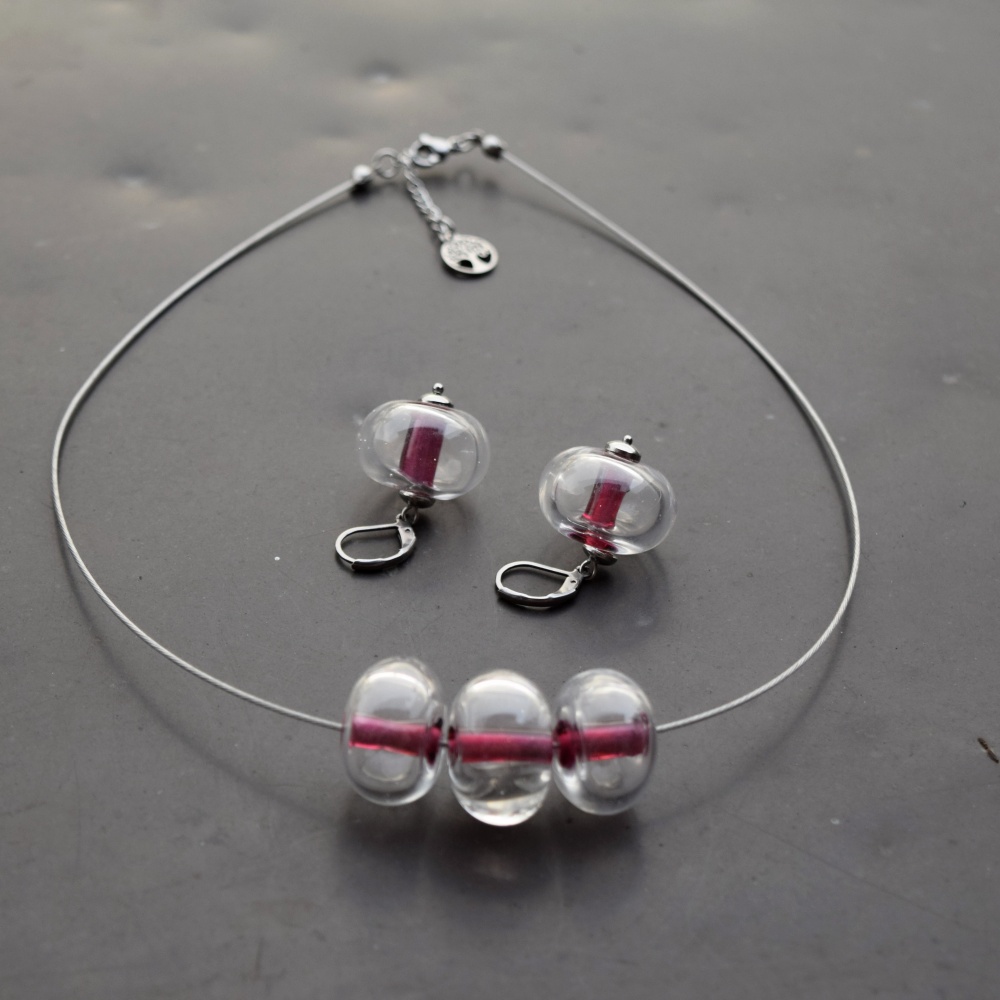 Vinuté perličky vyrábím ručně bez použití formy na sklářském kahanu, na tyto jsem použila italské a české lampové sklo, zapínání a ostatní kovové části jsou z chirurgické nerezové oceli – jsou tedy vhodné i pro alergiky.