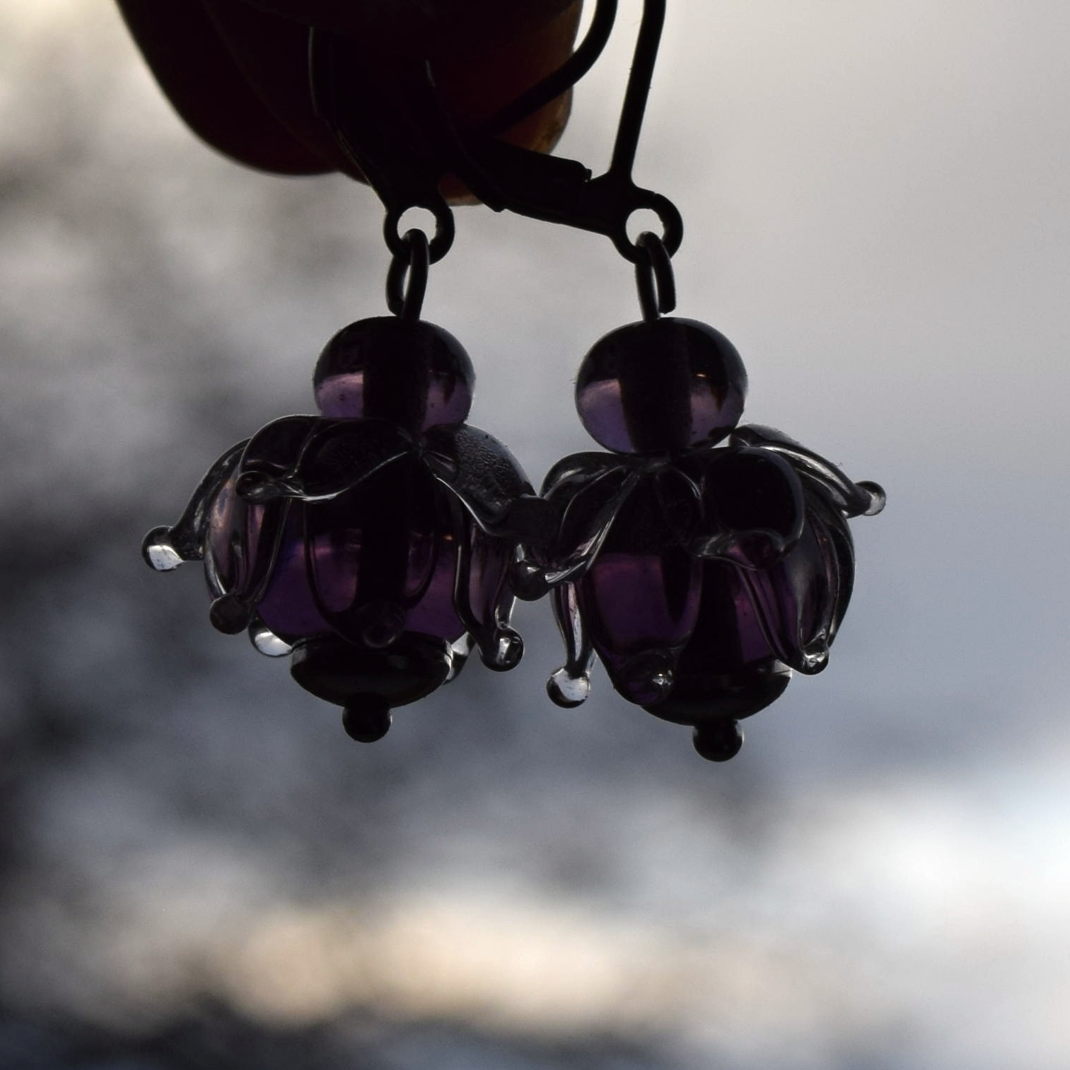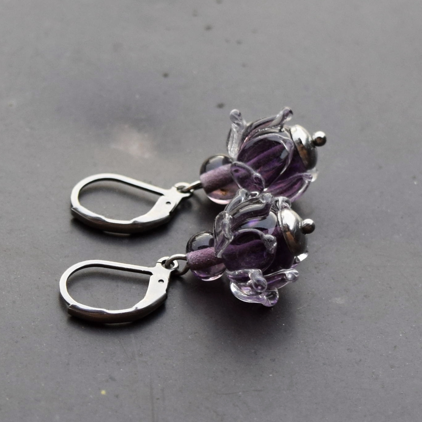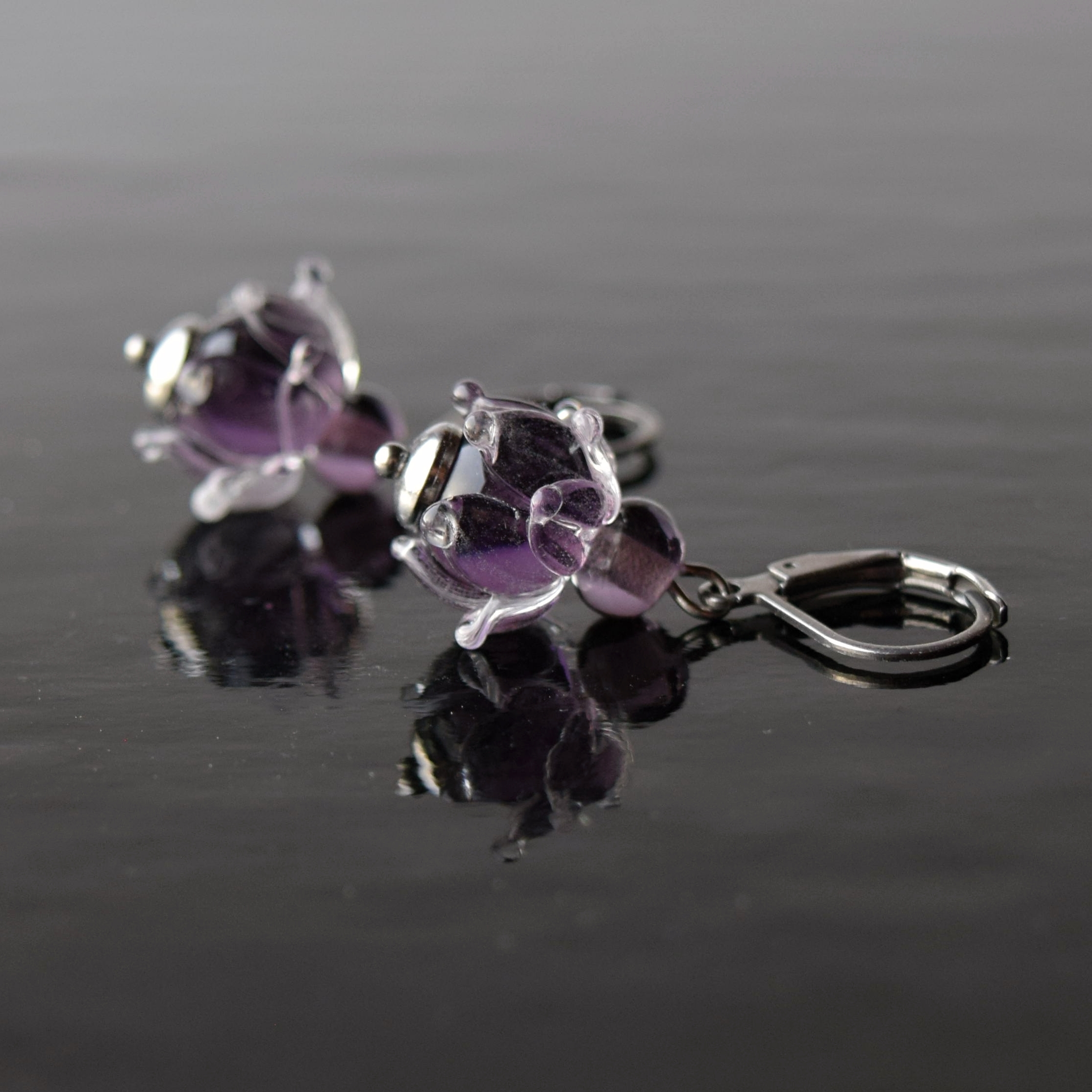 Náušnice se ručně vyrobenými skleněnými perlemi z fialového skla – rozkvetlé kytičky, které Vám nezvadnou.