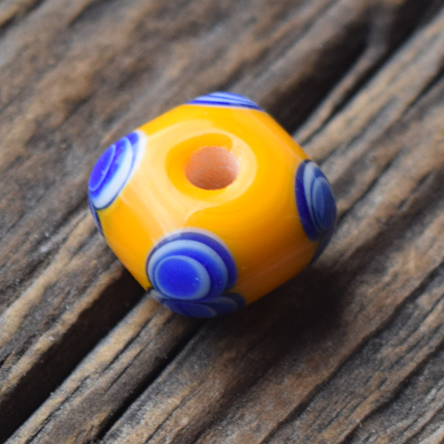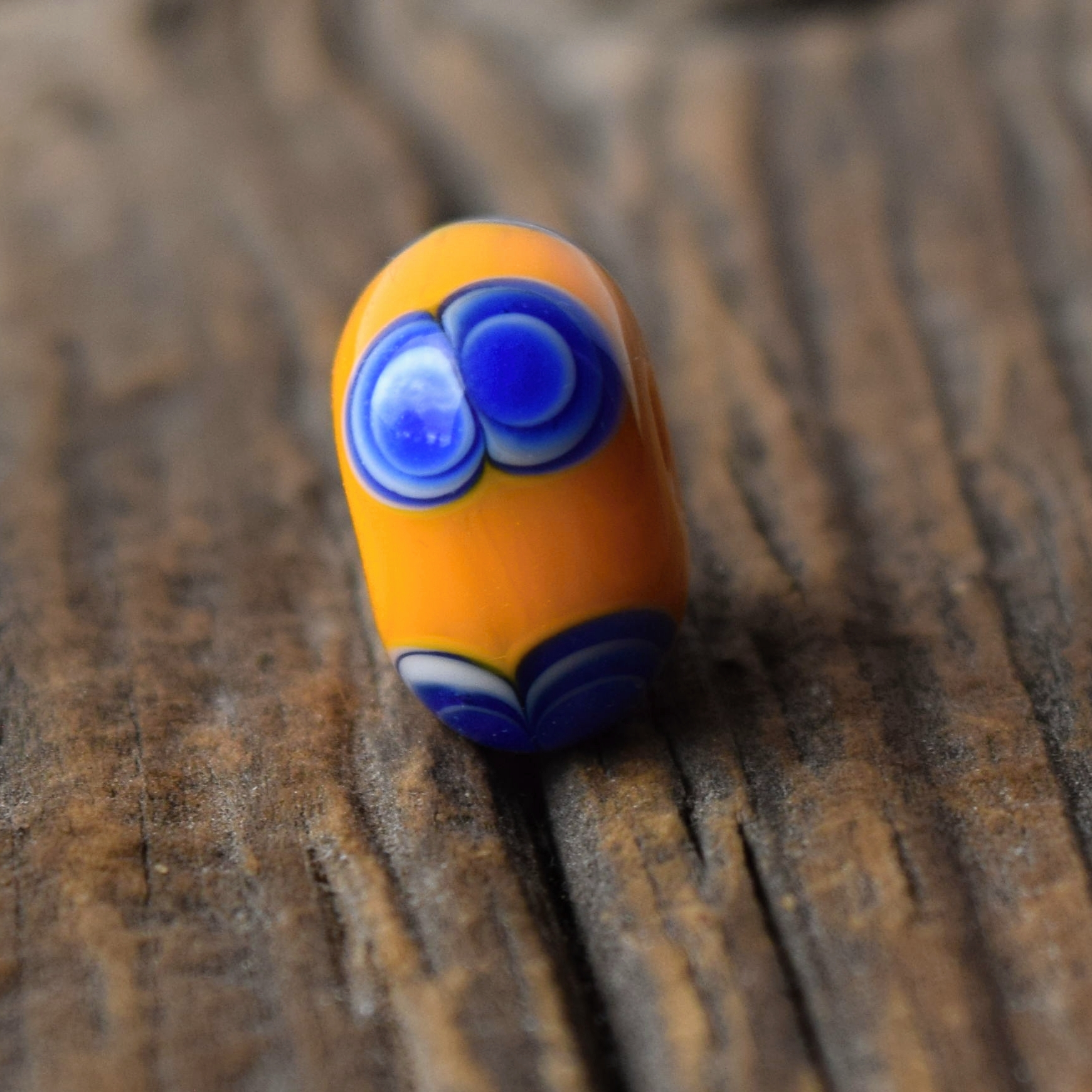 Replika keltského korálku s dvojitým očkem. Korálek je ručně vyrobený na sklářském kahanu starou technikou navíjení roztaveného skla na kovovou tyčku – podobně, jako vznikaly korálky v Halštatské době.