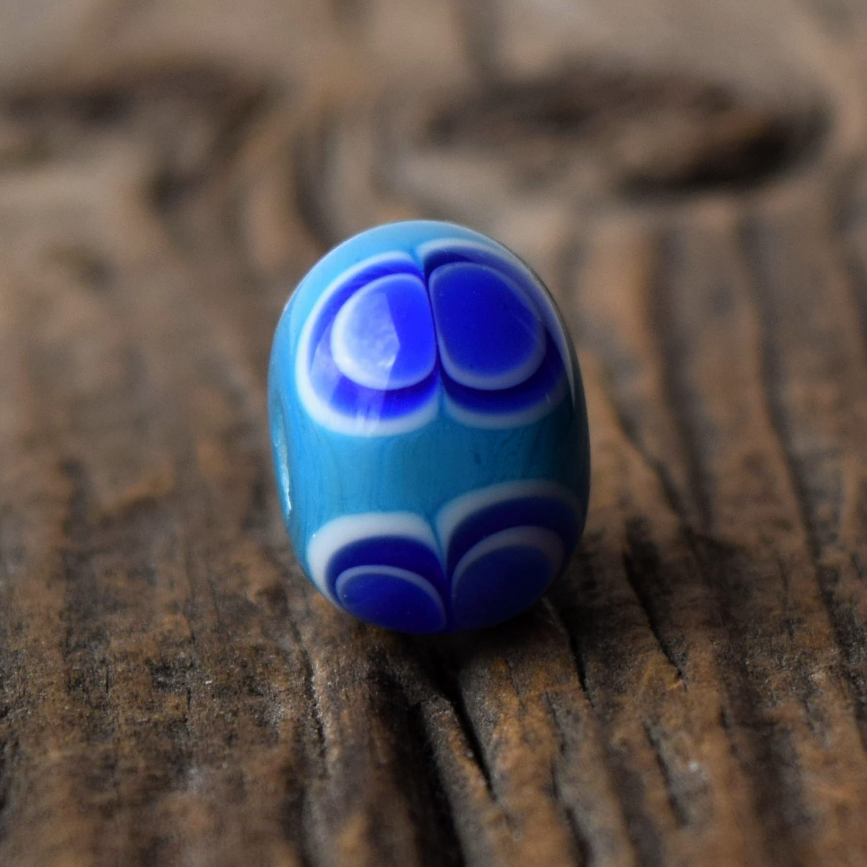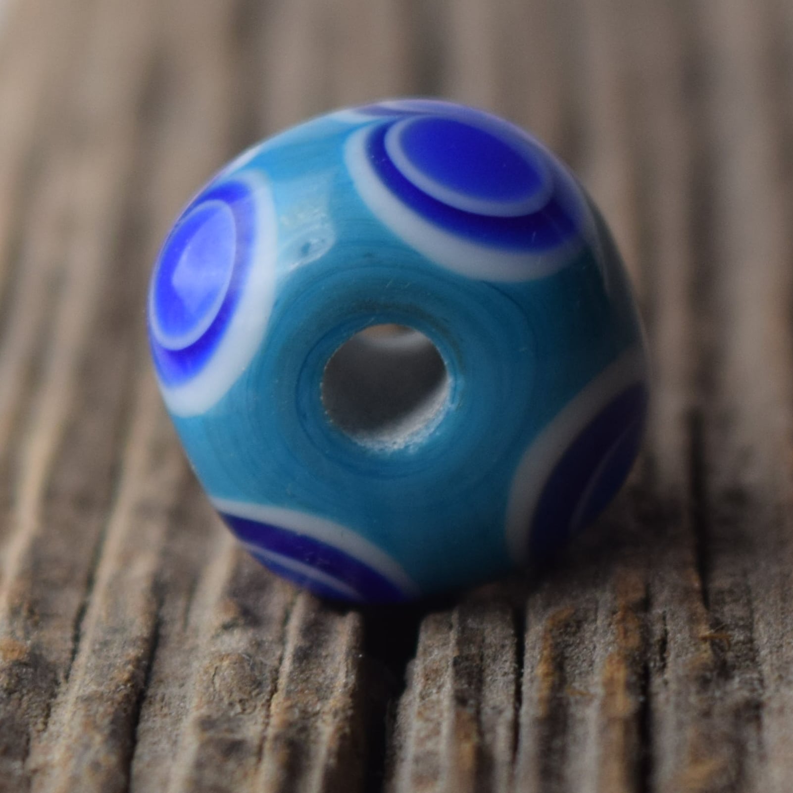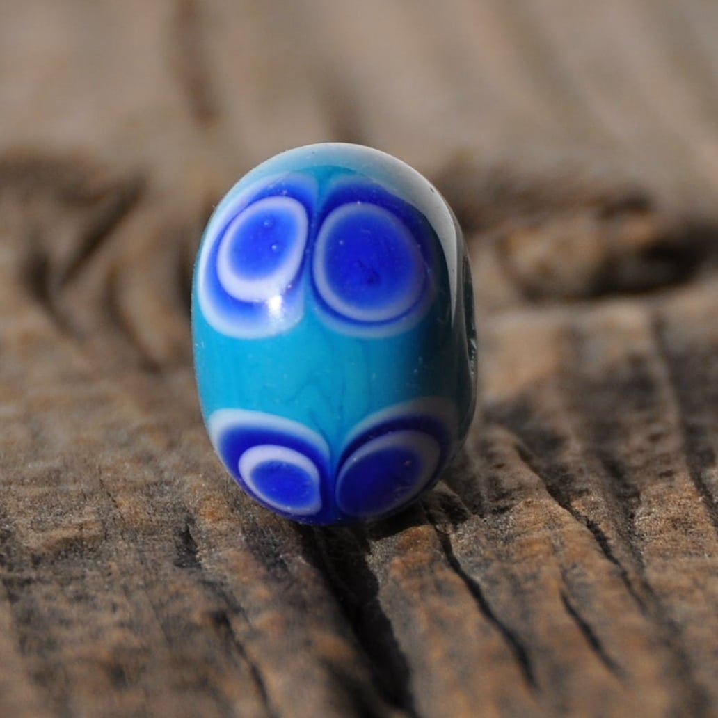 Replika keltského korálku s dvojitým očkem. Korálek je ručně vyrobený na sklářském kahanu starou technikou navíjení roztaveného skla na kovovou tyčku – podobně, jako vznikaly korálky v Halštatské době. Tento je inspirovaný nálezem ve Štramberku ale samozřejmě podobné najdete ve své době po celé Evropě.