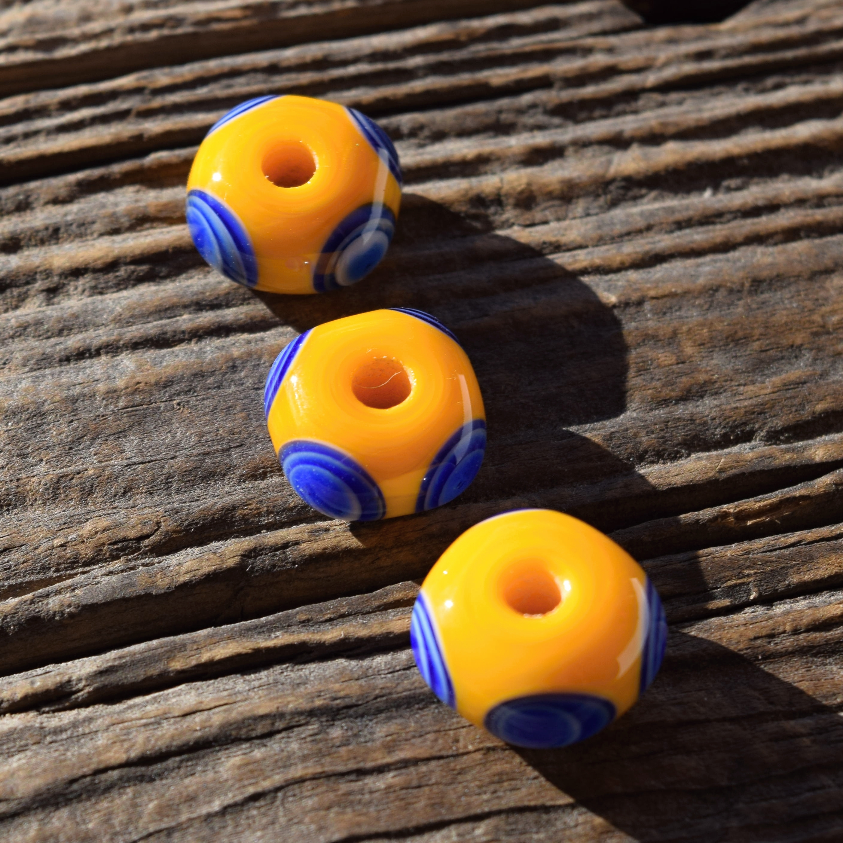 Replika keltského korálku se čtyřmi očky. Korálek je ručně vyrobený na sklářském kahanu starou technikou navíjení roztaveného skla na kovovou tyčku – podobně, jako vznikaly korálky v Halštatské době.
