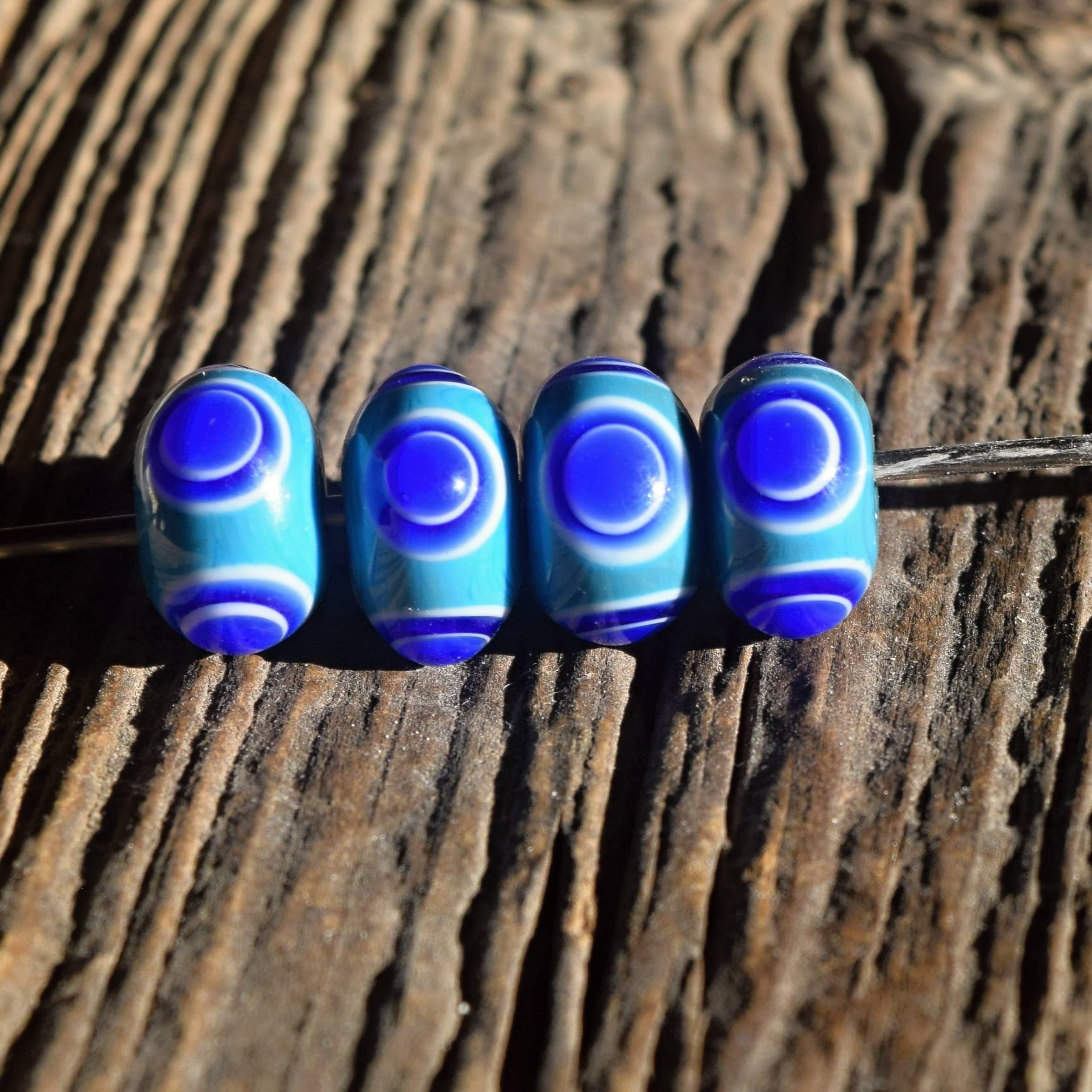 Replika keltského korálku se čtyřmi očky. Korálek je ručně vyrobený na sklářském kahanu starou technikou navíjení roztaveného skla na kovovou tyčku – podobně, jako vznikaly korálky v Halštatské době.