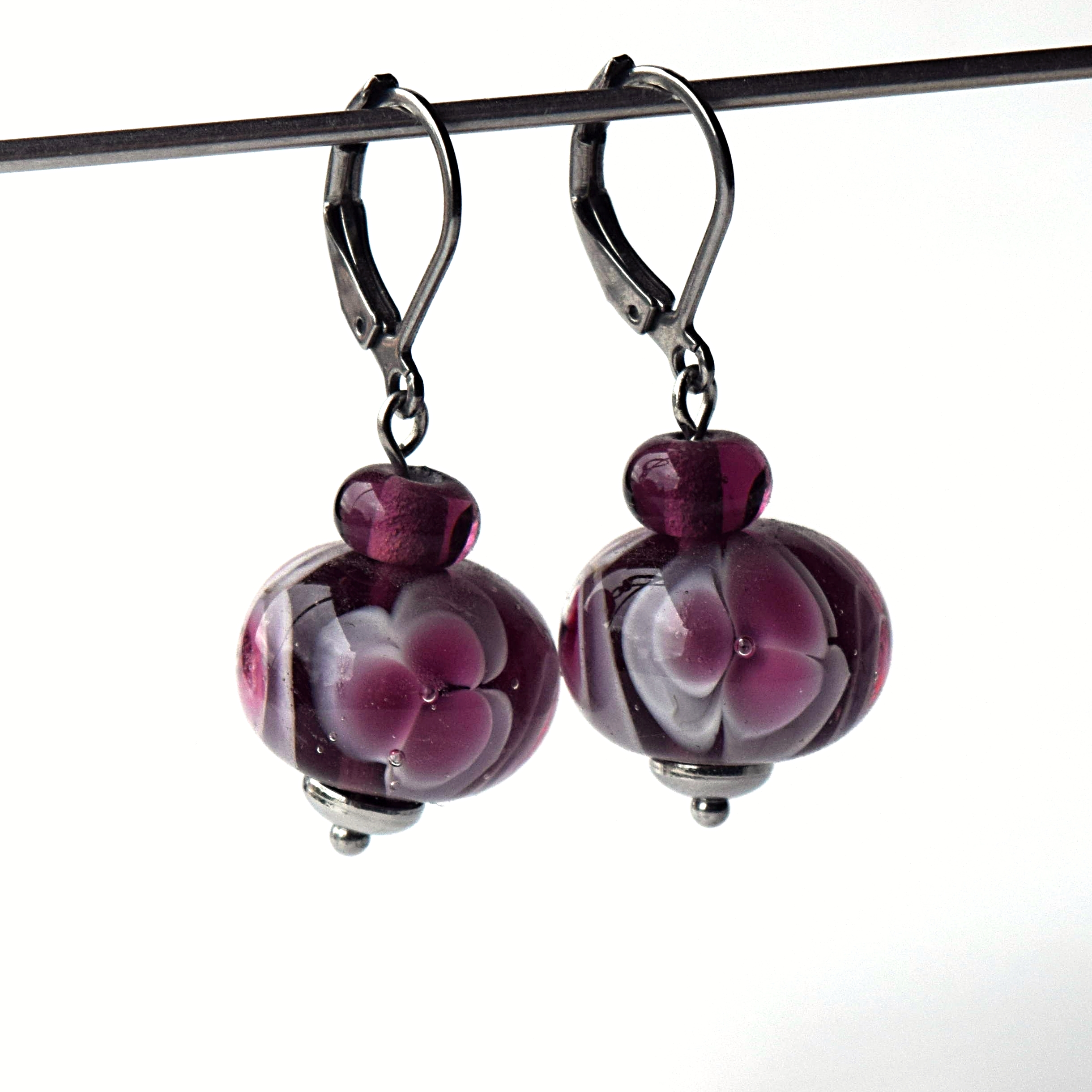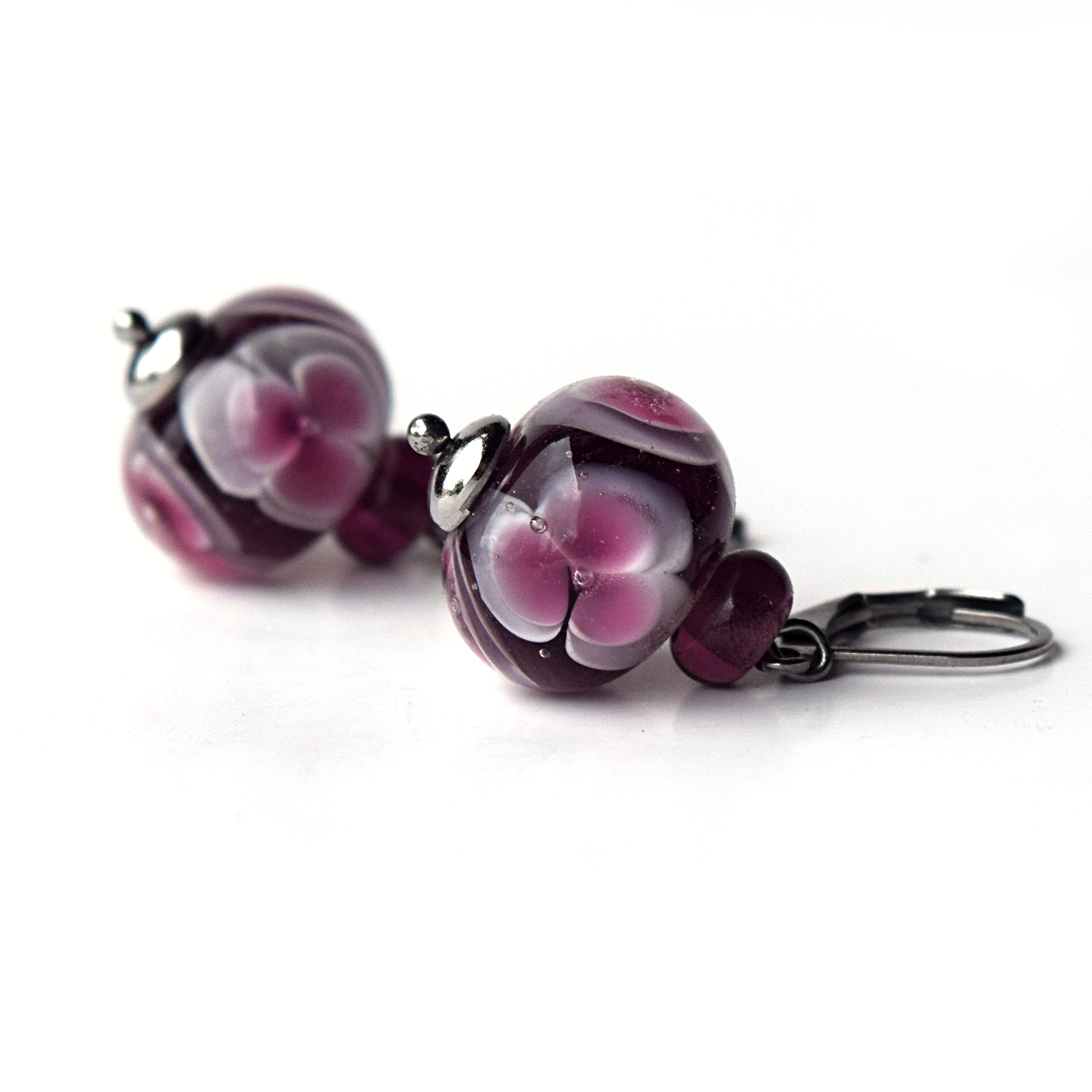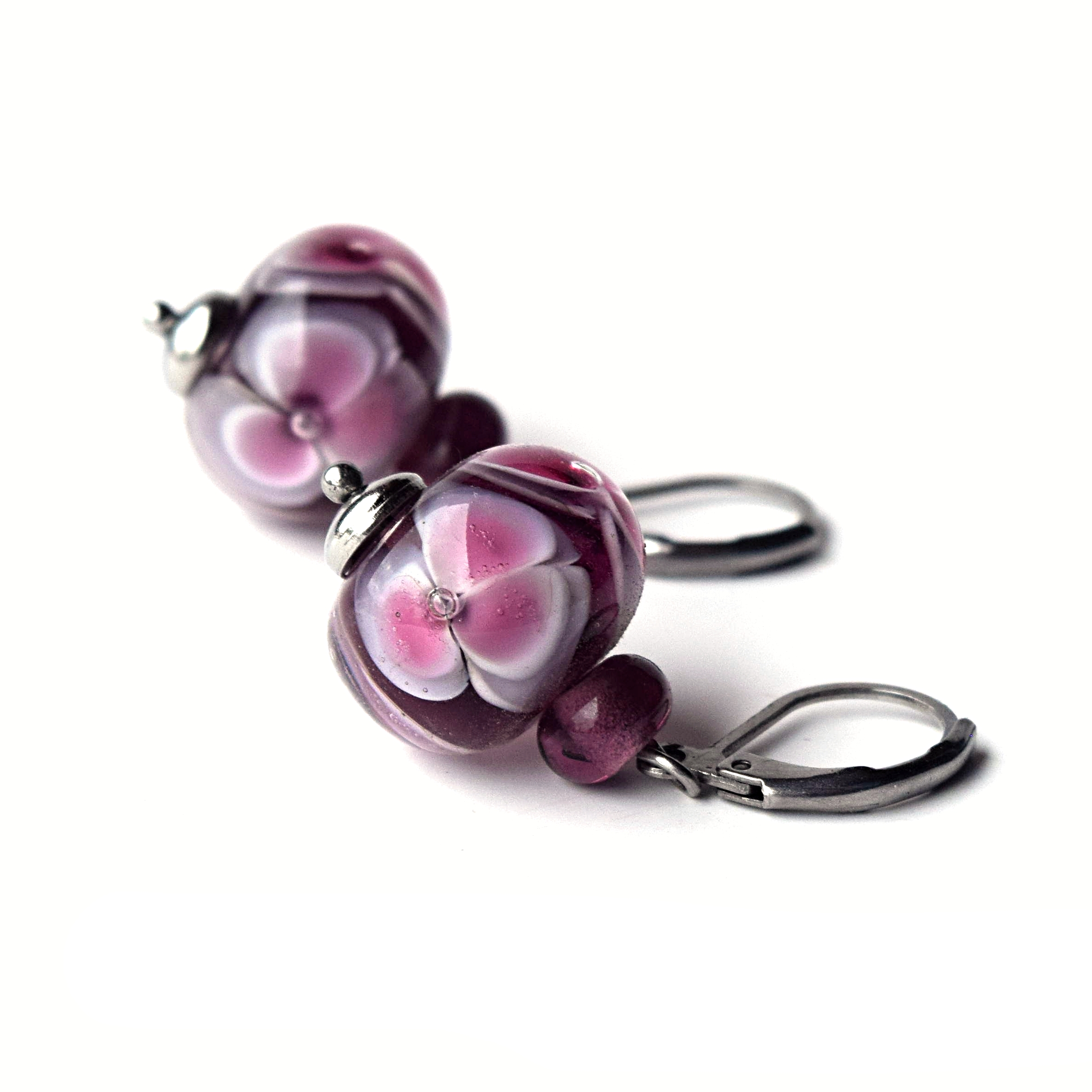 Romantické náušnice s kytičkami – s ručně vinutými perlemi z lampového skla z mé dílny z ametystového skla s růžovými kytičkami.