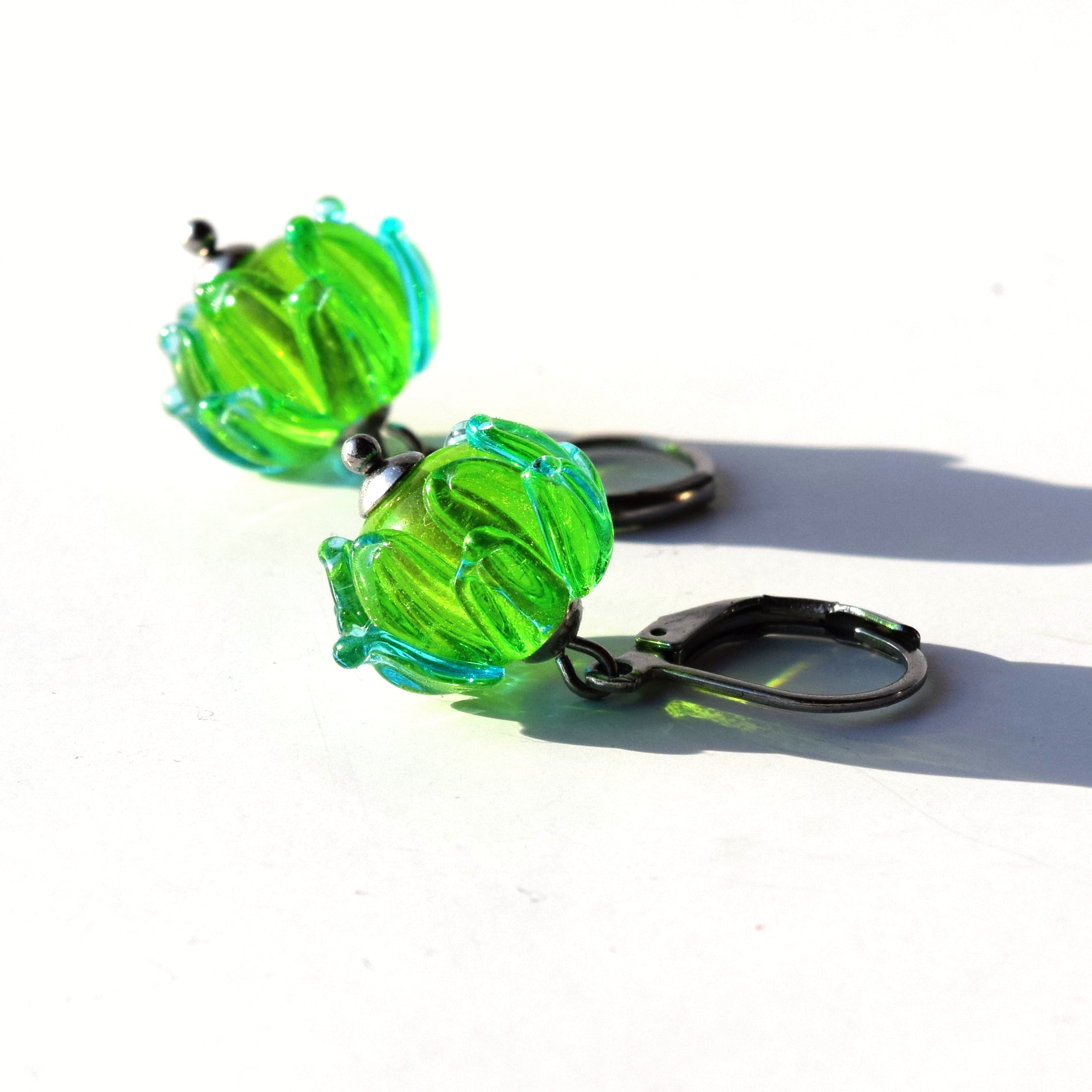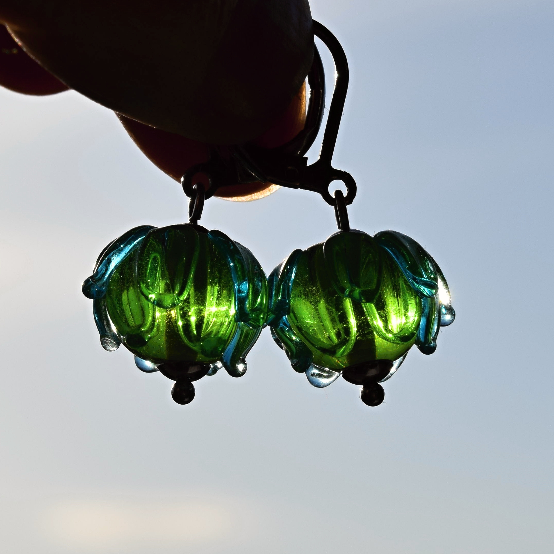Náušnice s ručně vinutými perlemi ve tvaru kvítku. Hlavní barva je svěží zelená, ale lístky jsou z modrého skla a tak se barva mění pode toho, jak se náušnice pohupují a přechází ze zelené k modrozelené.