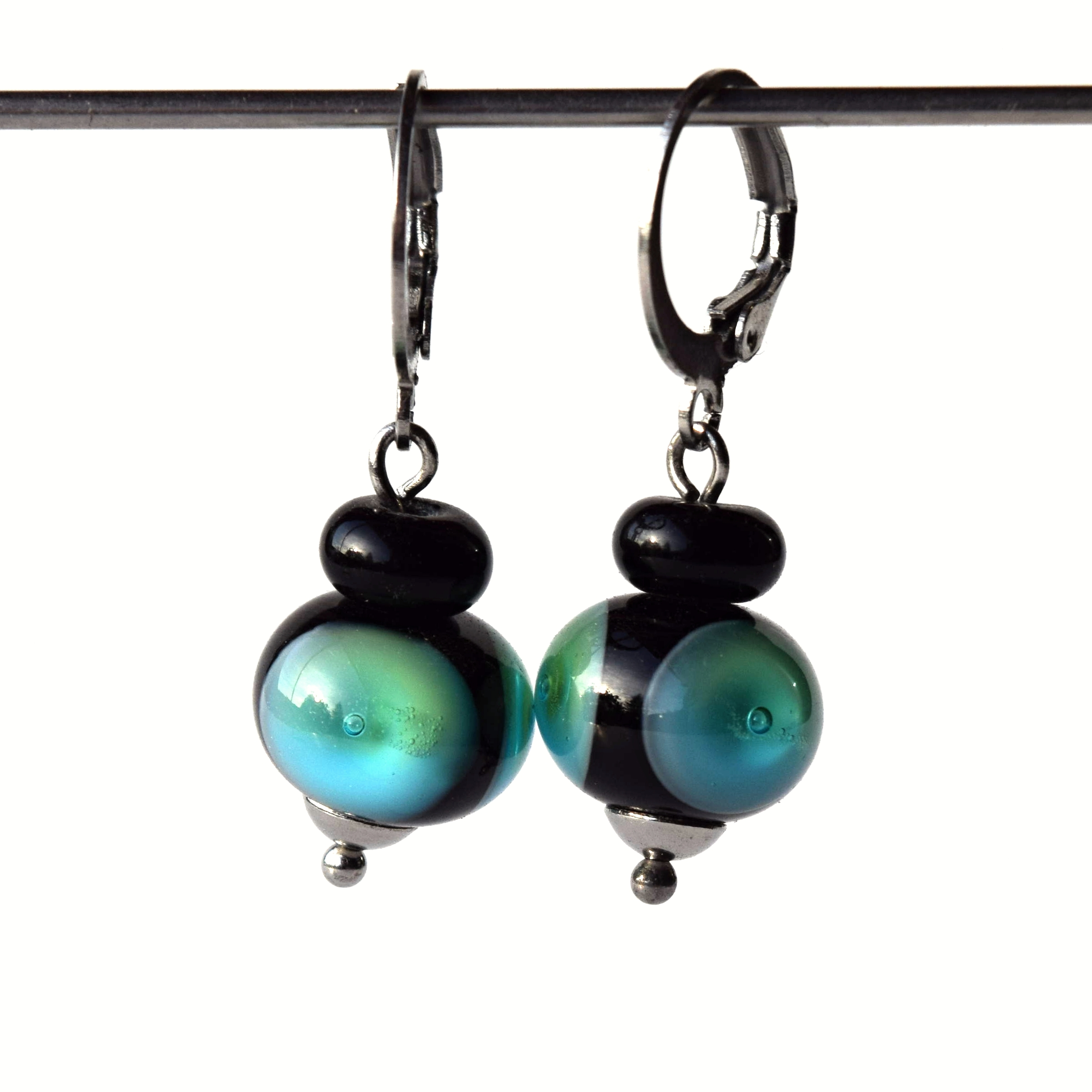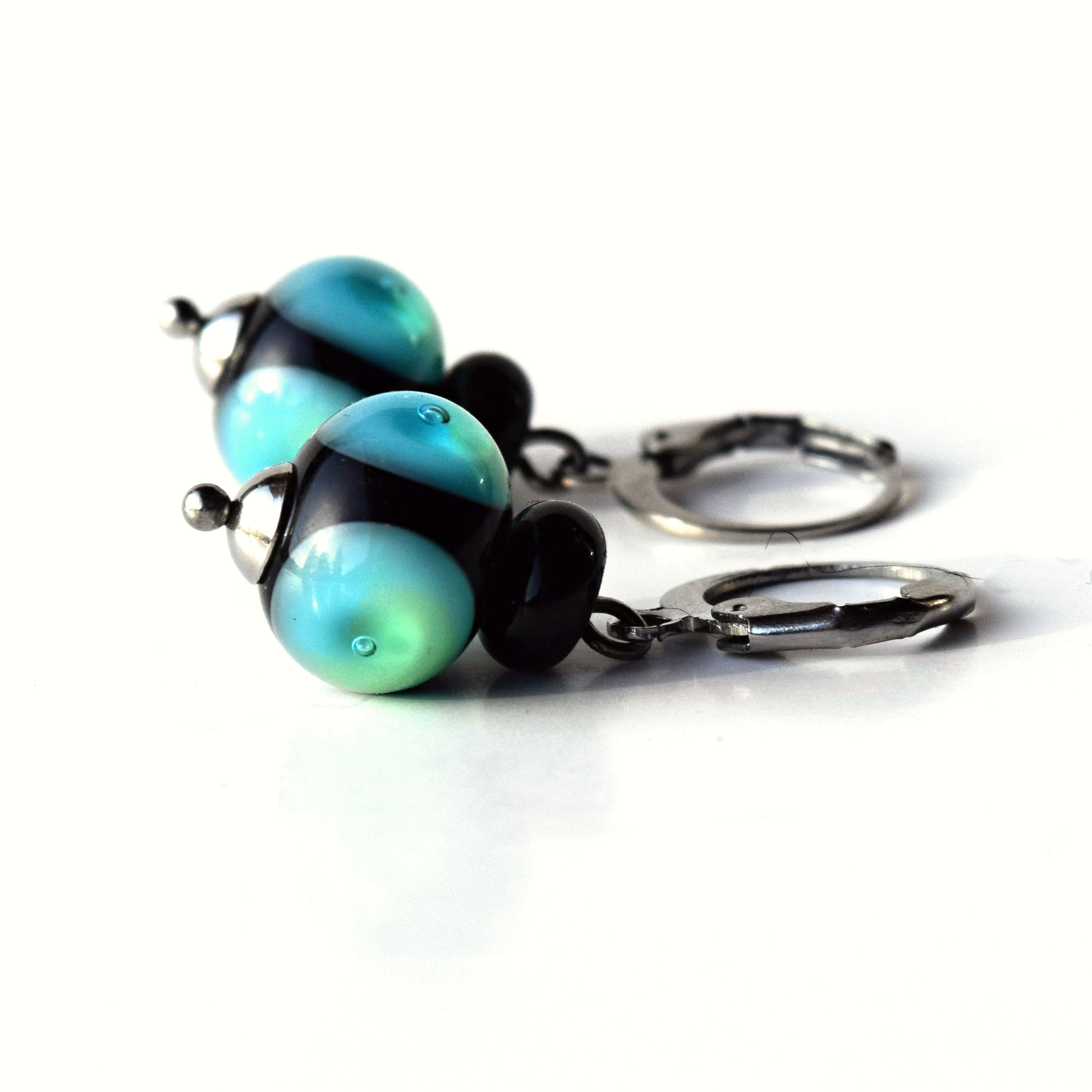 Náušnice s ručně vyráběnými vinutými perlemi se studánkami ze zeleno-modrého skla, v každé ze studánek je ve skle zalitá malá bublinka, Vinutky jsem vyrobila ručně z italského lampového sklo, zapínání je z chirurgické nerezové oceli – náušnice jsou tedy vhodné i pro alergiky.  Délka náušnice s afroháčkem je cca 3,4 cm.