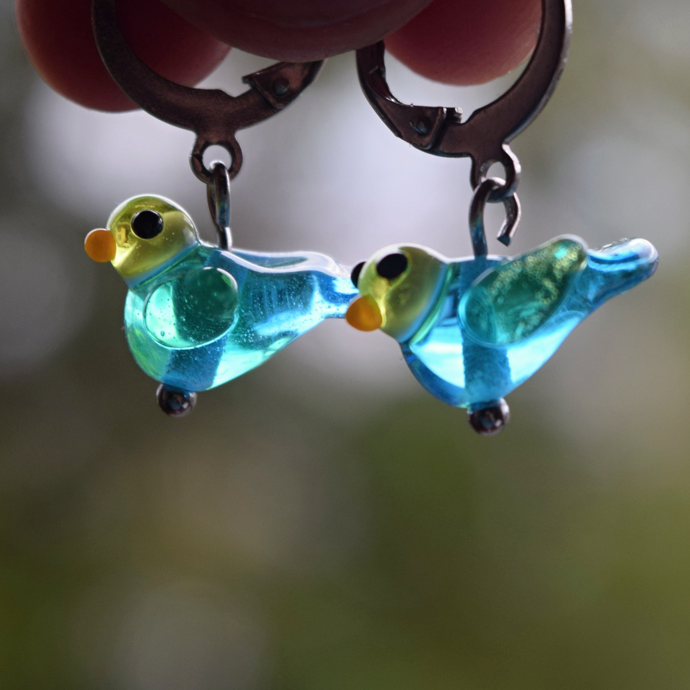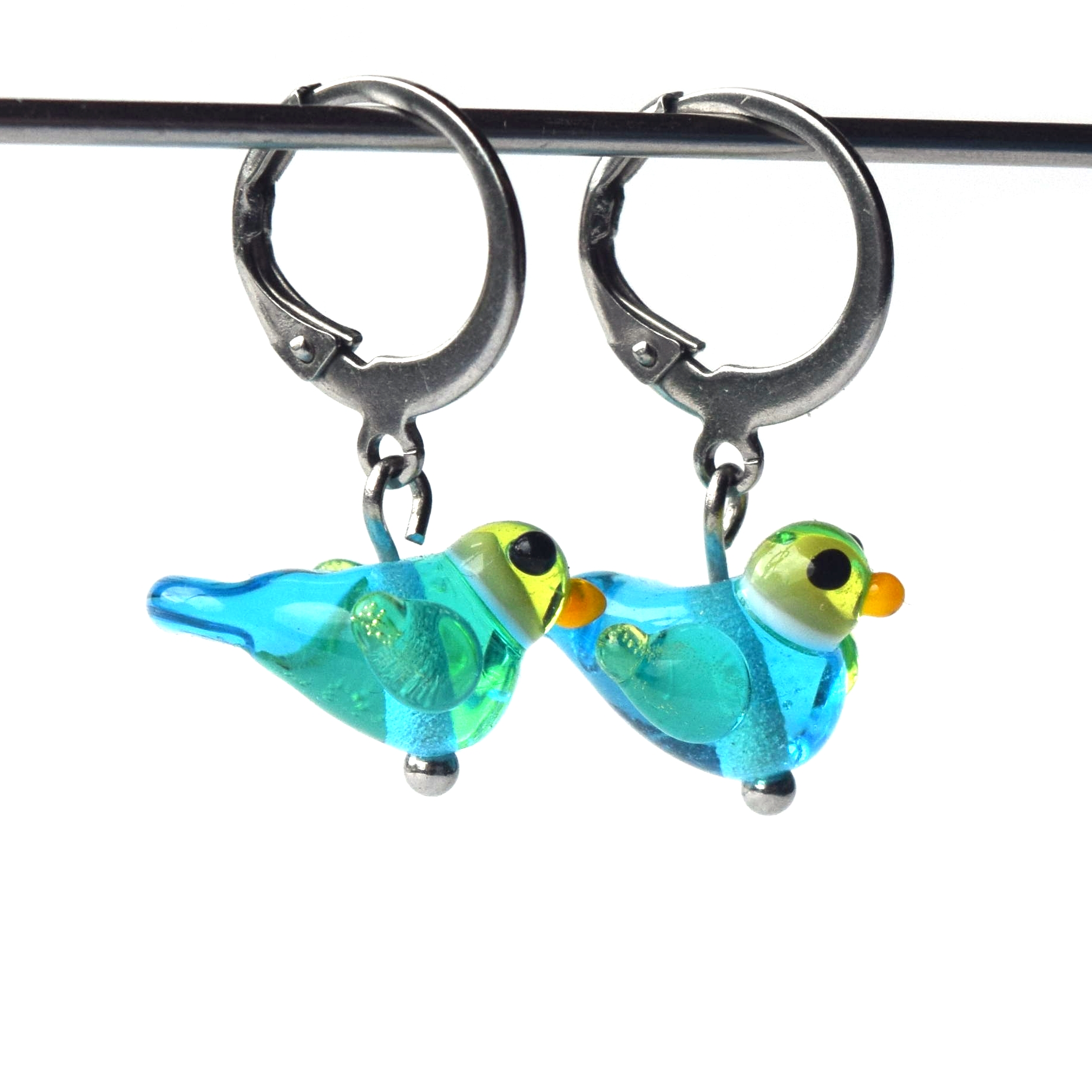 Hravé náušnice se ručně vyrobenými skleněnými perlemi. Ptáčci z modrého a zeleného skla.