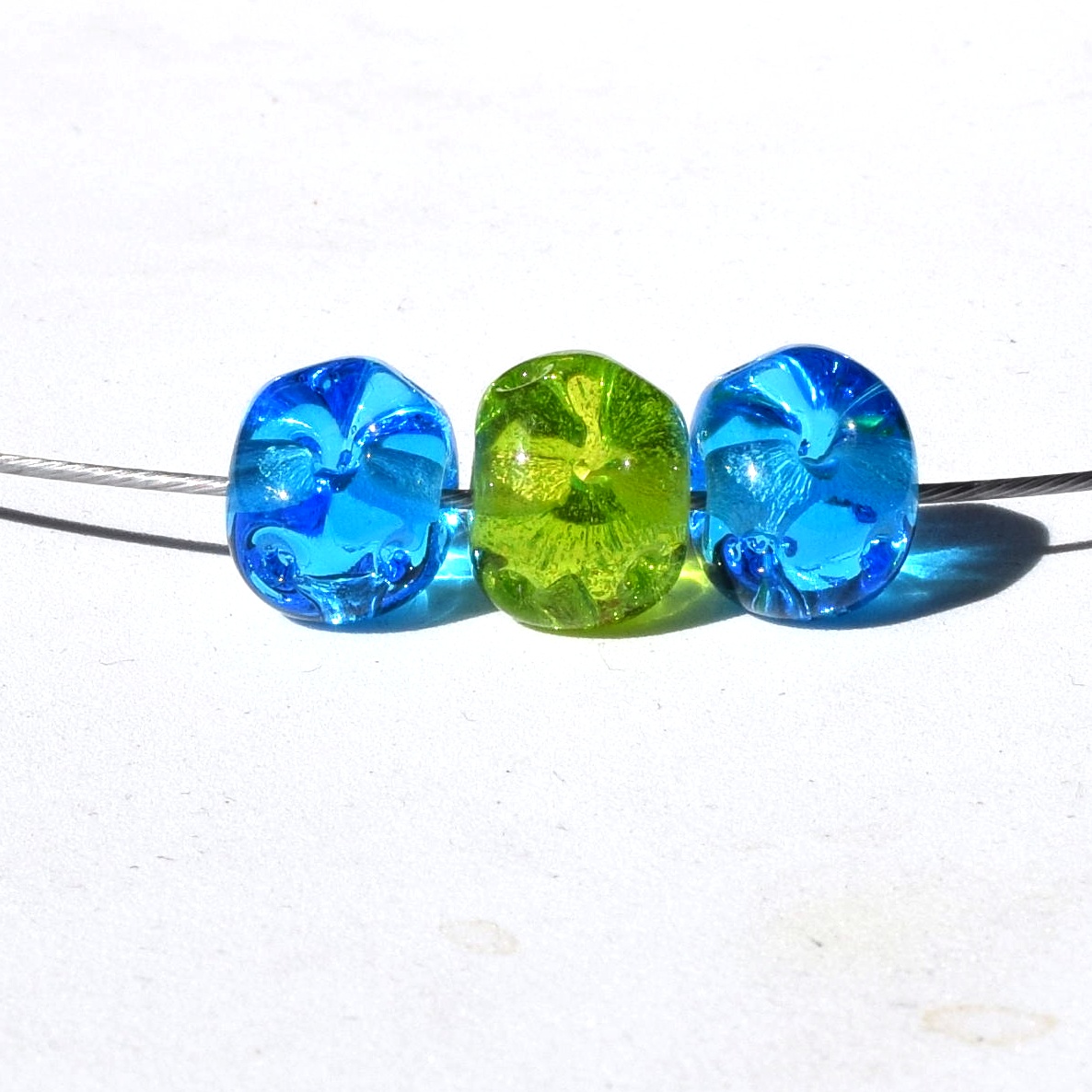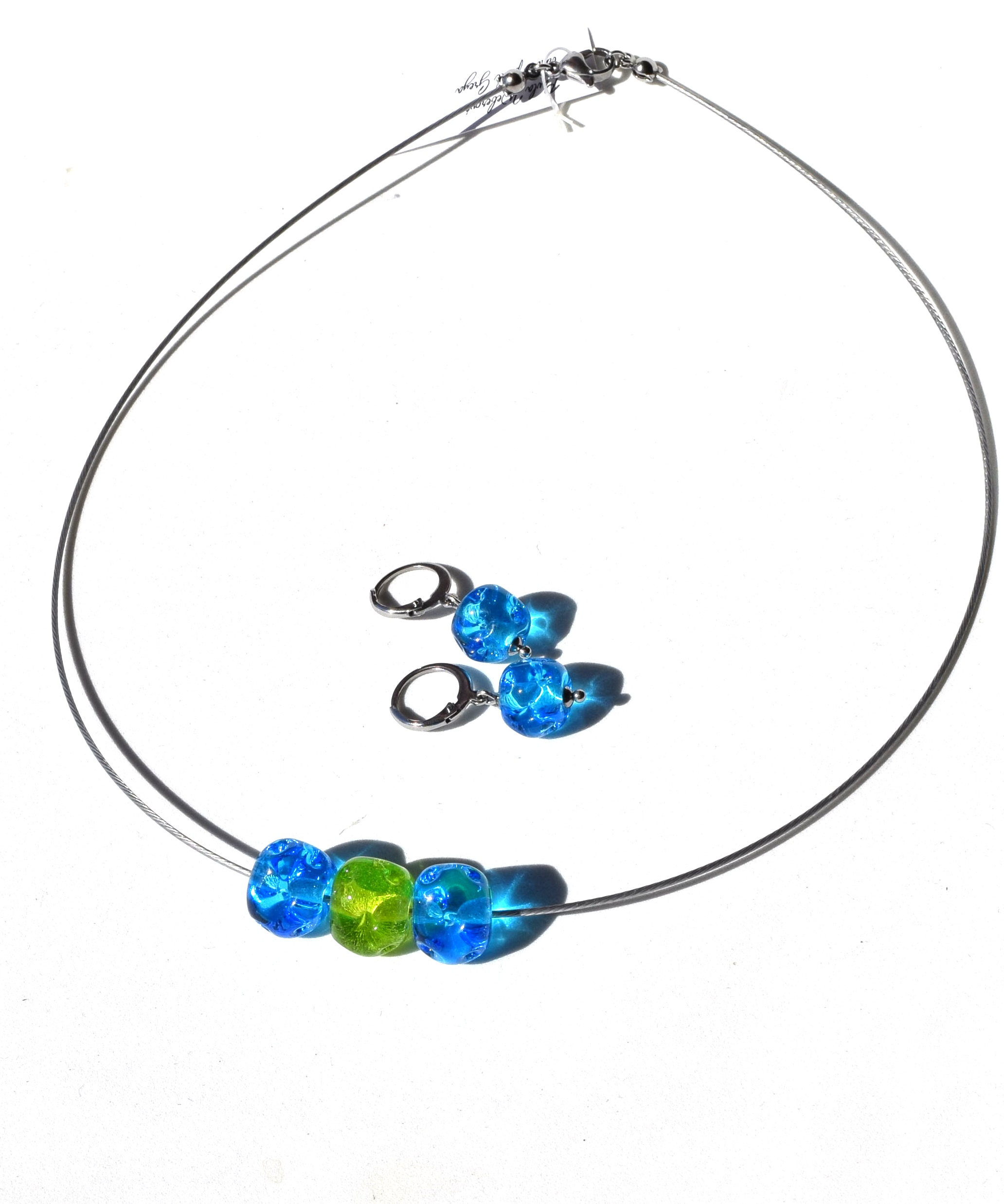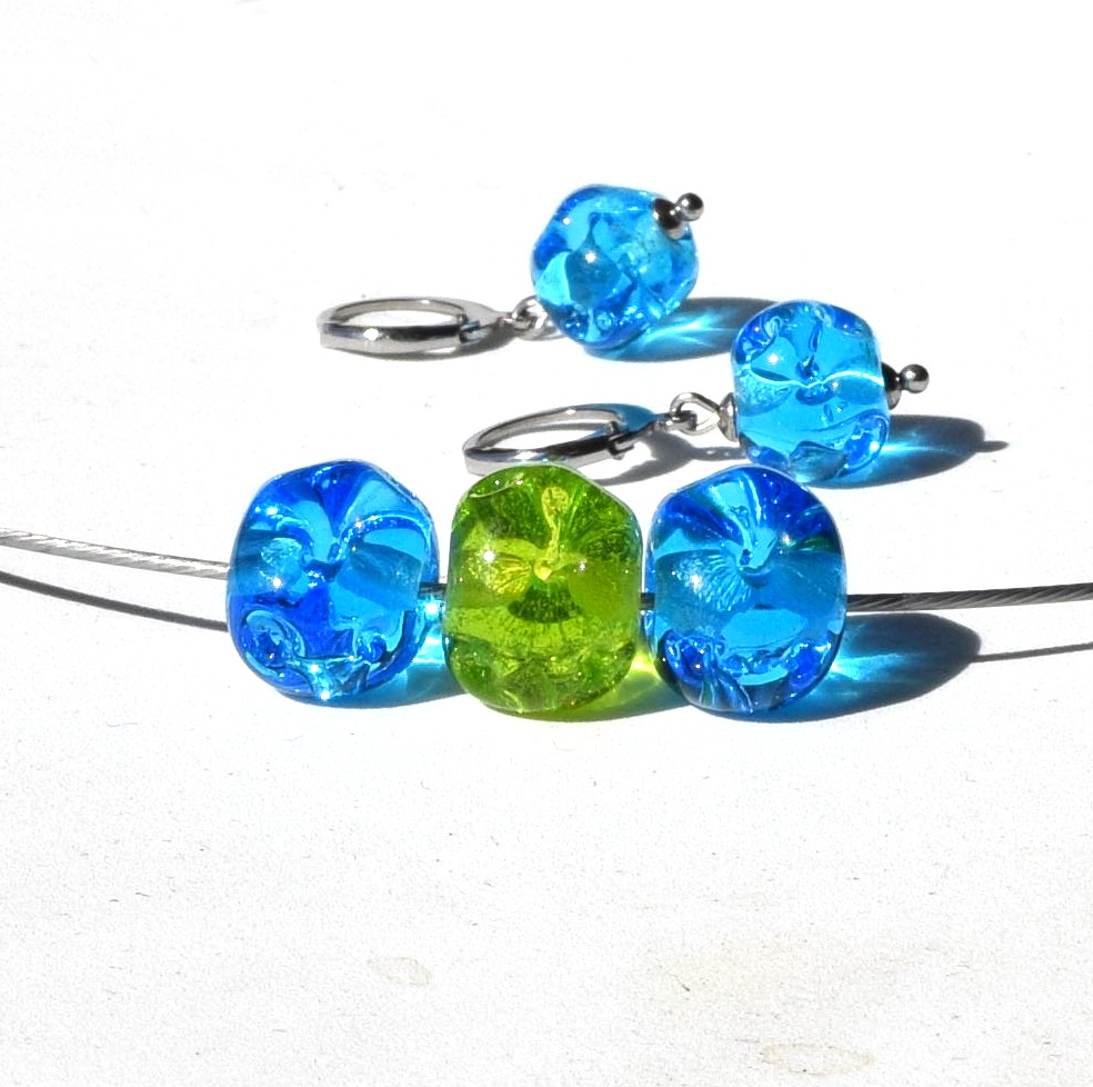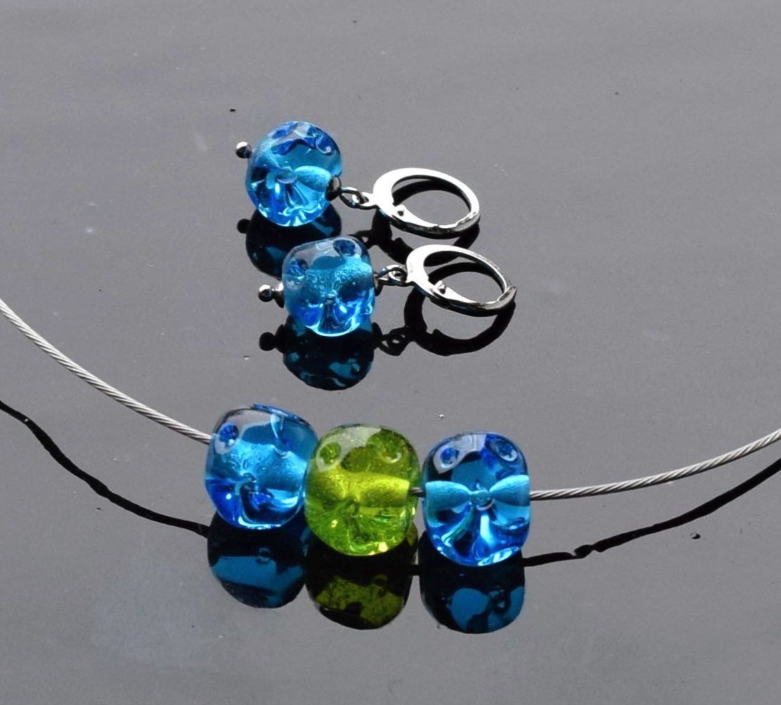 Souprava náhrdelníku a náušnic z modrých a zelených ručně vinutých perel