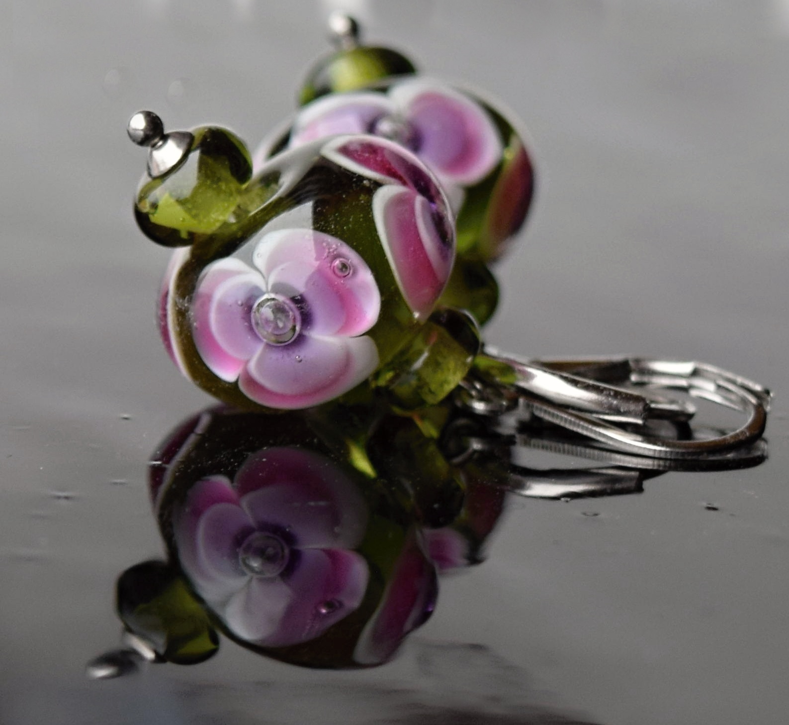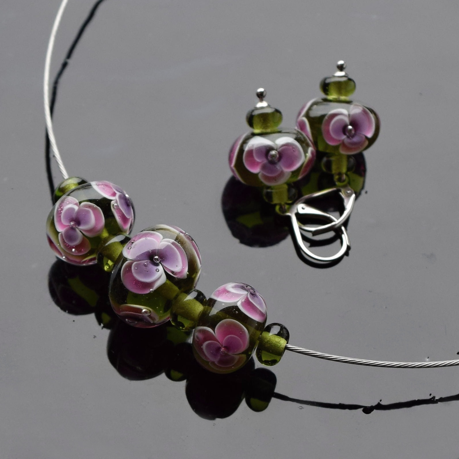 Náhrdelník – ručně vinuté lampové perle z českého a italského skla jsou navlečené na bižuterním lanku se zapínáním z nerezové oceli, délka lanka cca 45 cm. Náušnice mají bezpečnostní zapínání z chirurgické oceli.