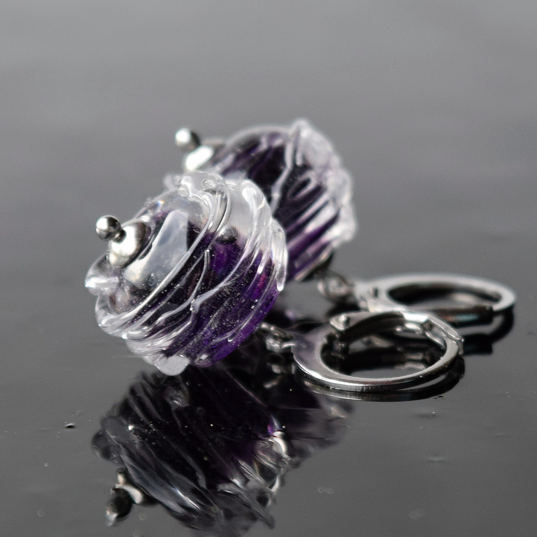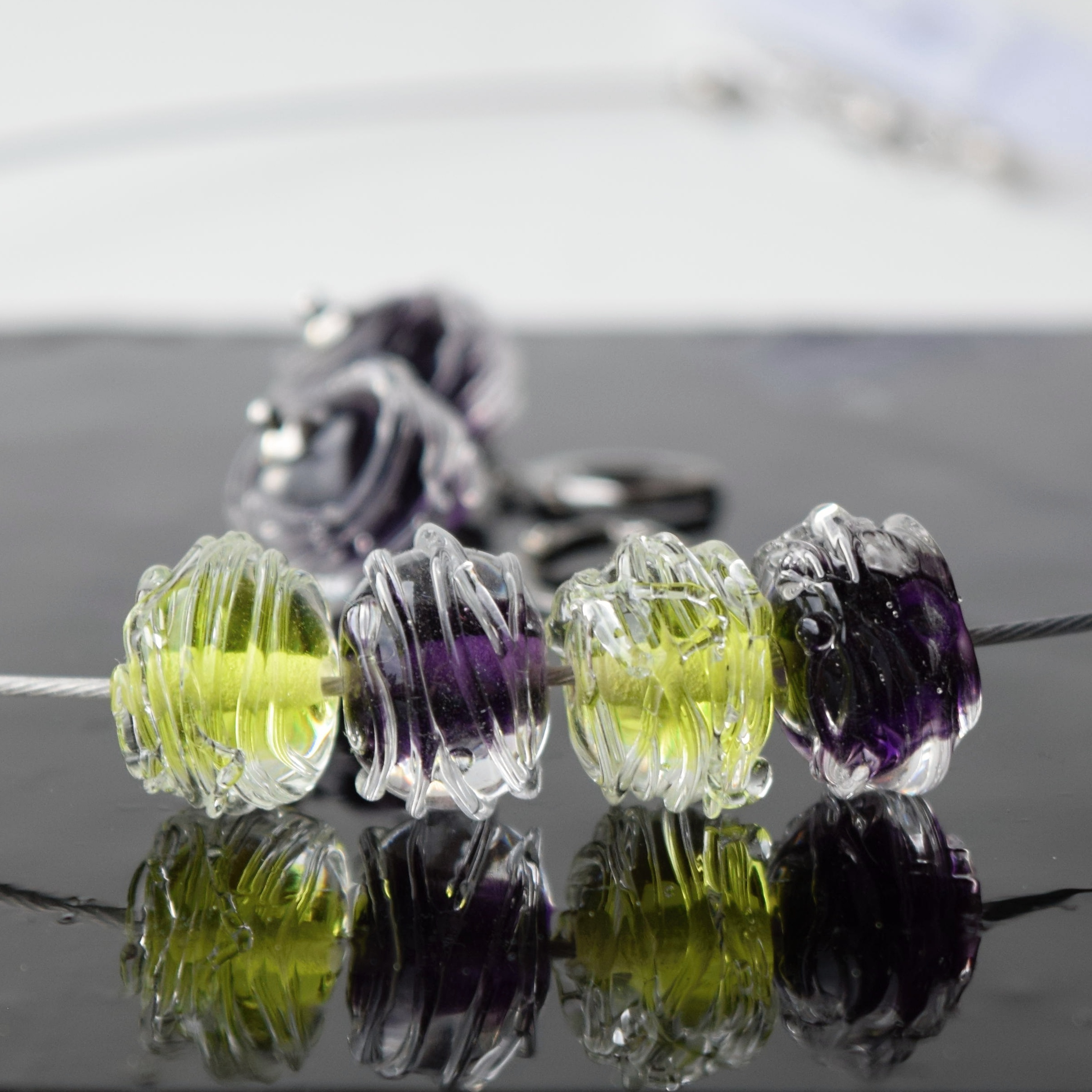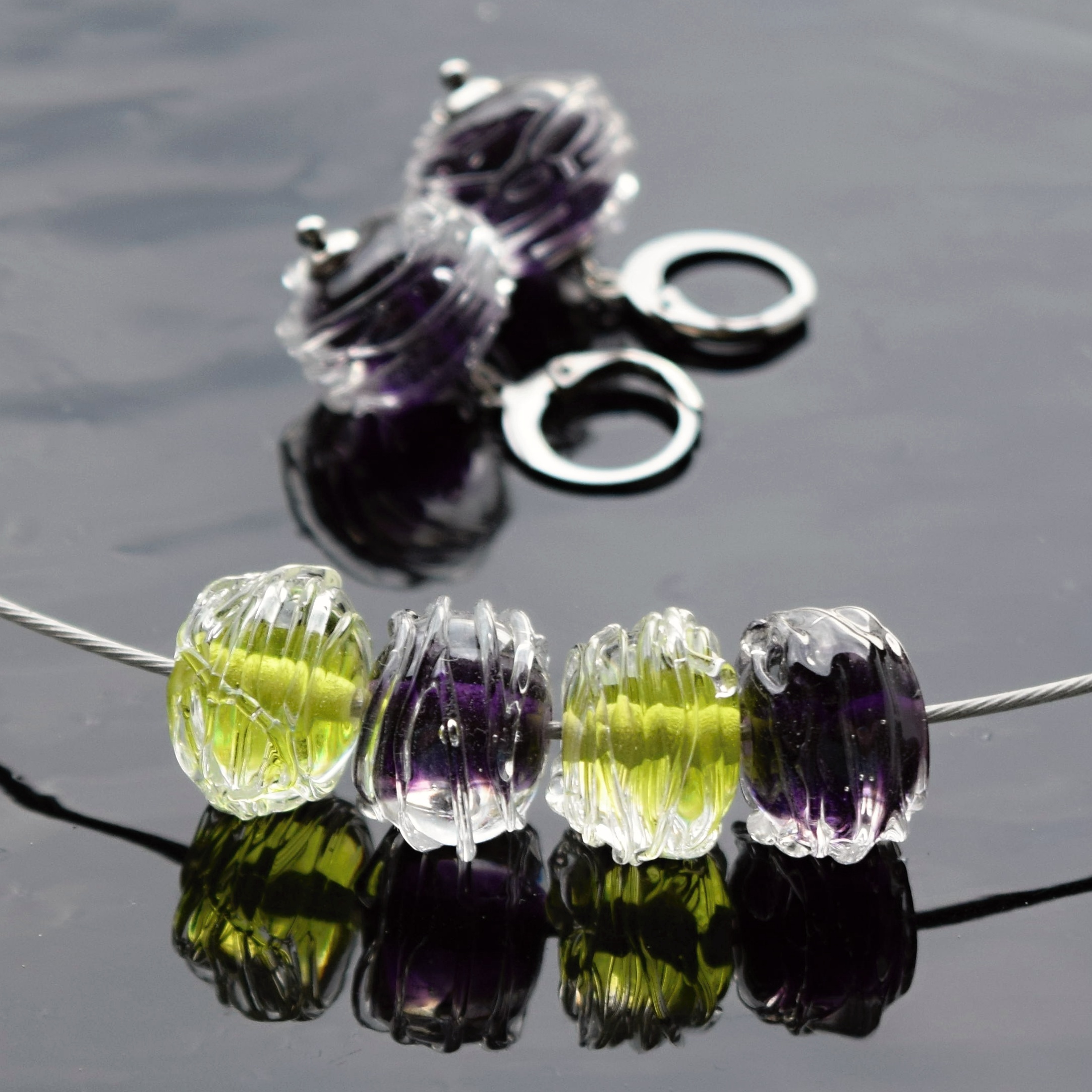 Originální a nadčasové šperky z ručně vyrobených vinutých perel z mé dílny. Na tyto jsem použila jasně zelené a fialové sklo a také skleněný křišťál, aby barvy krásně vynikly