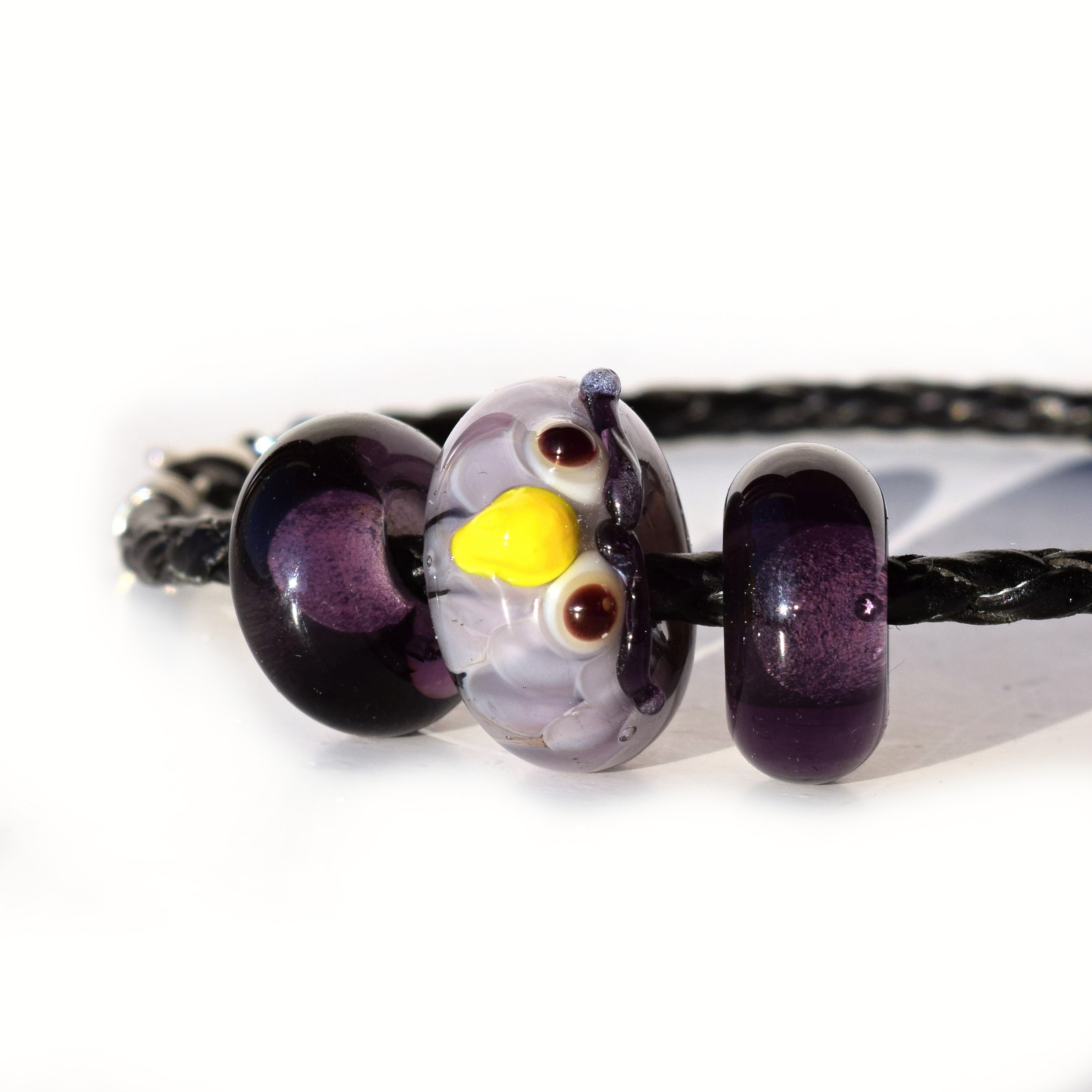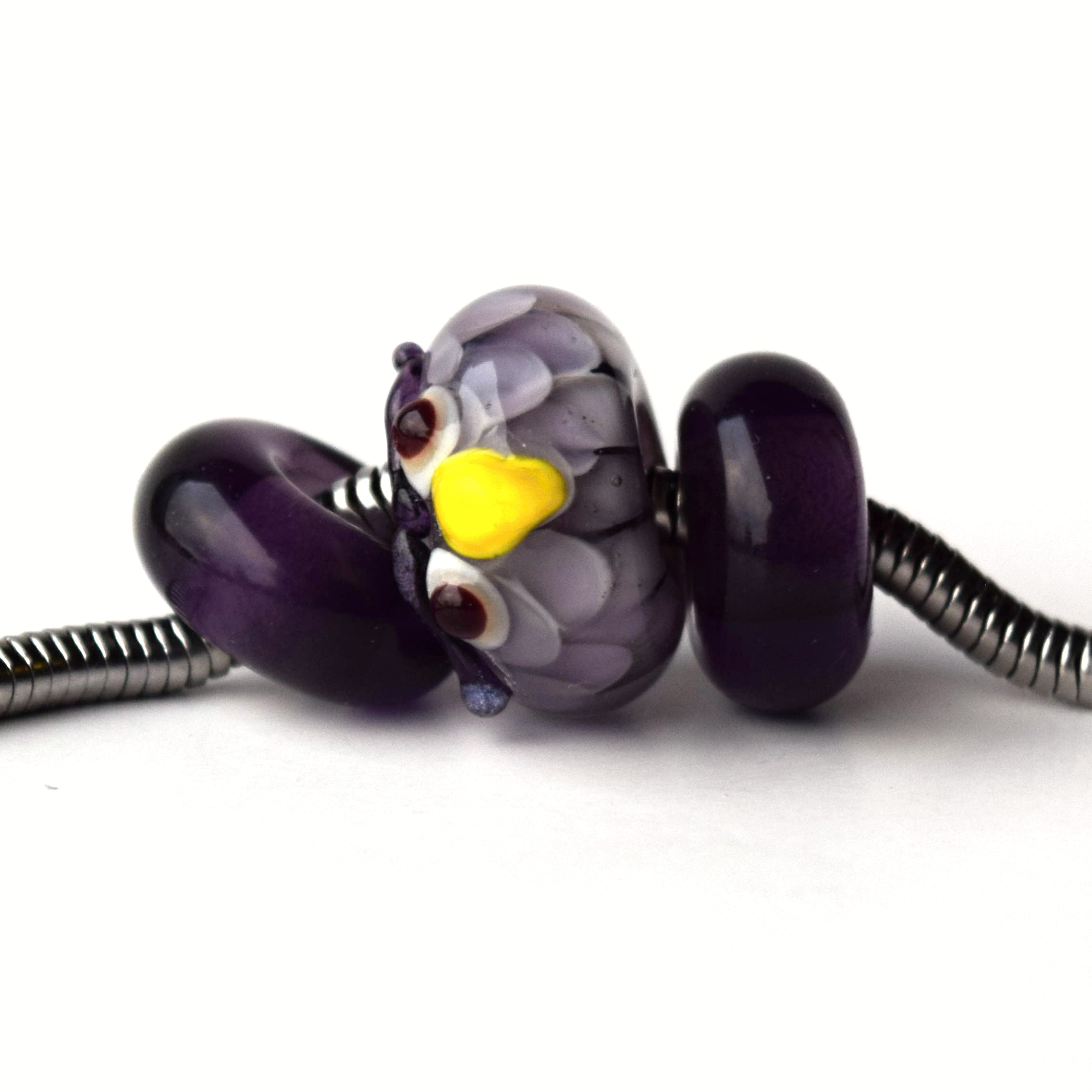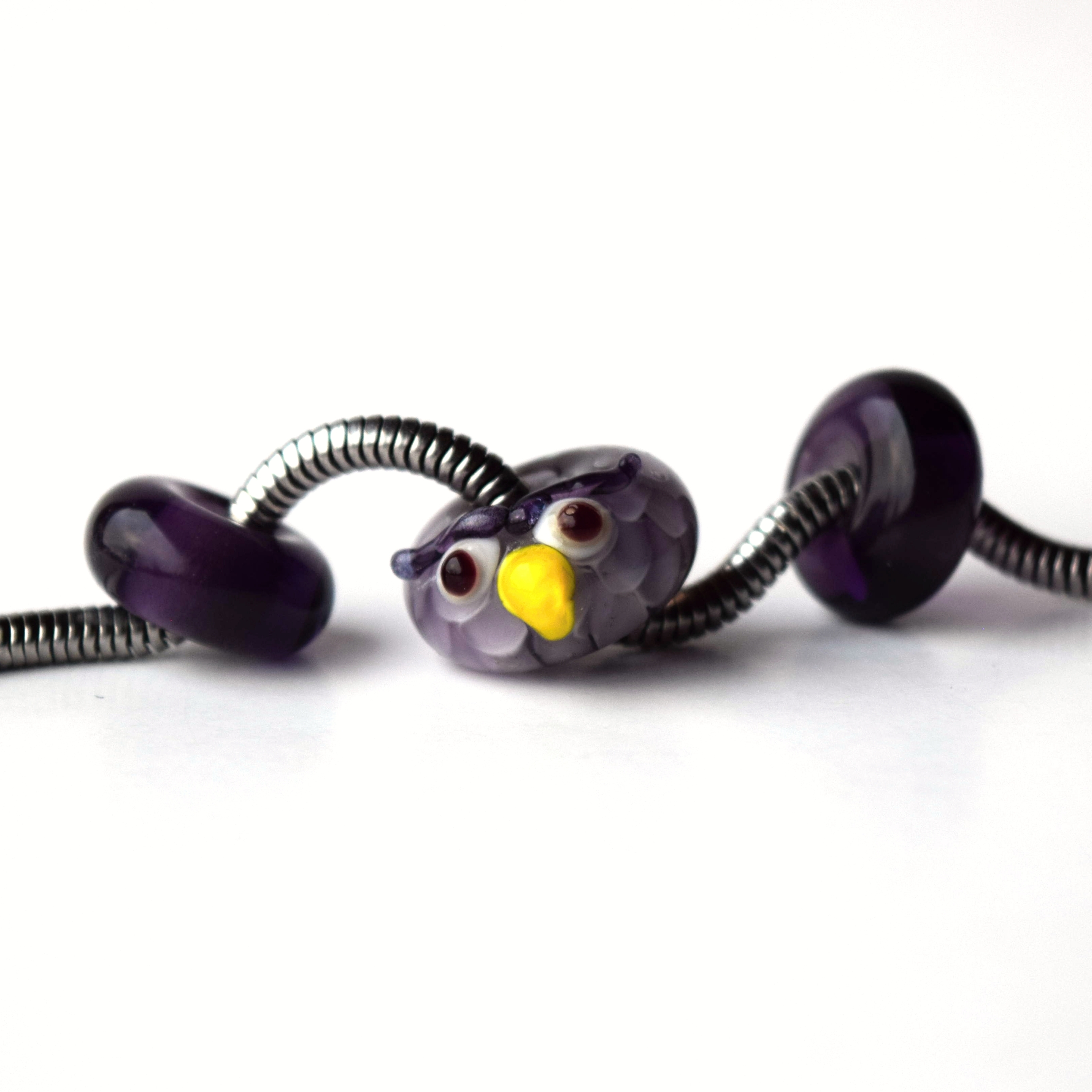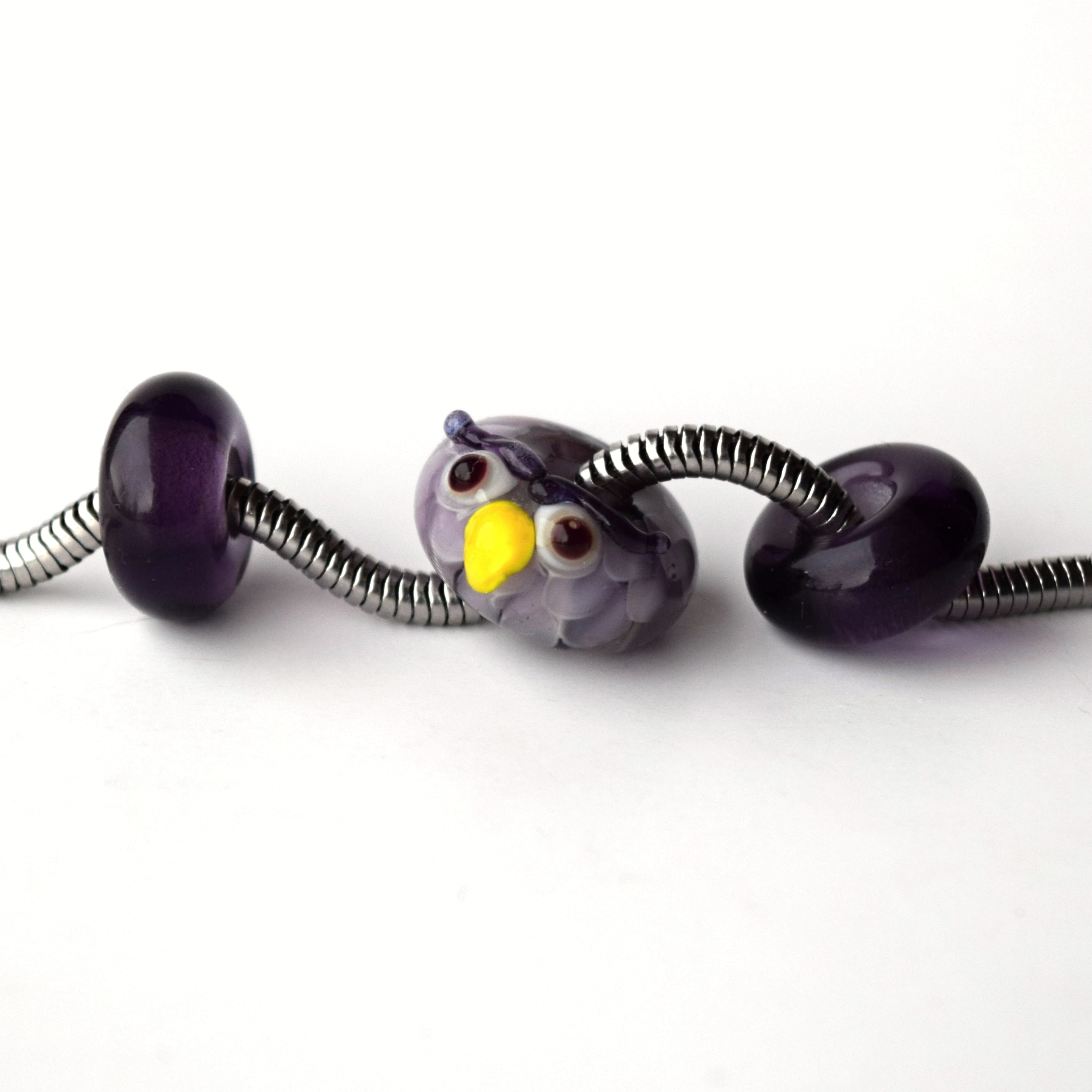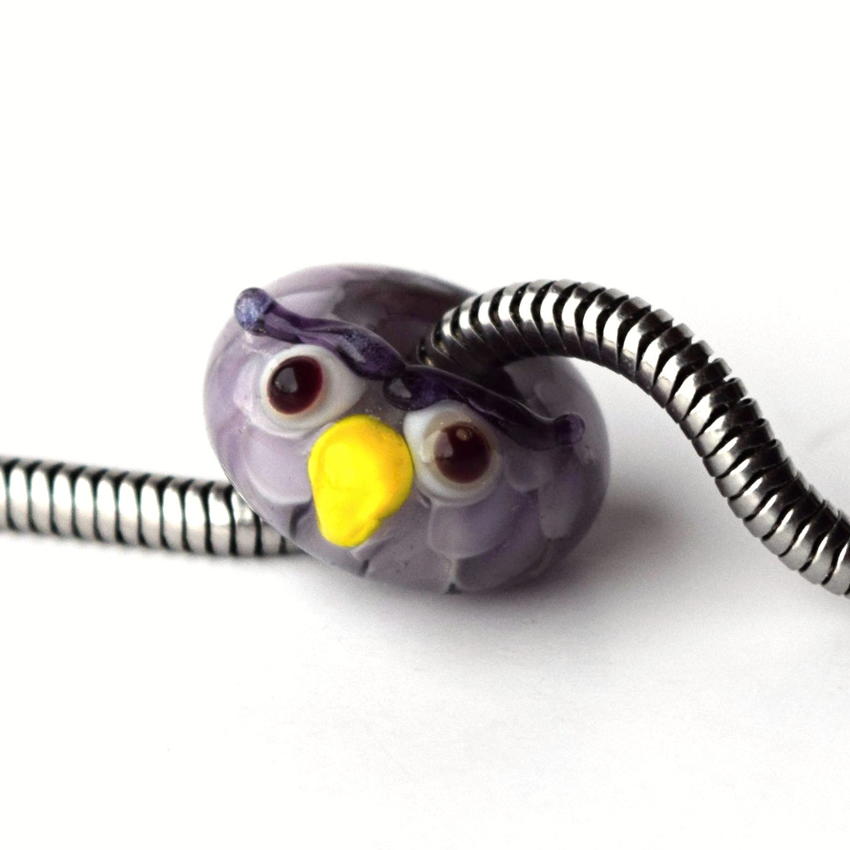 Autorská vinuté perle sova je ručně vyrobená z fialového lampového skla.