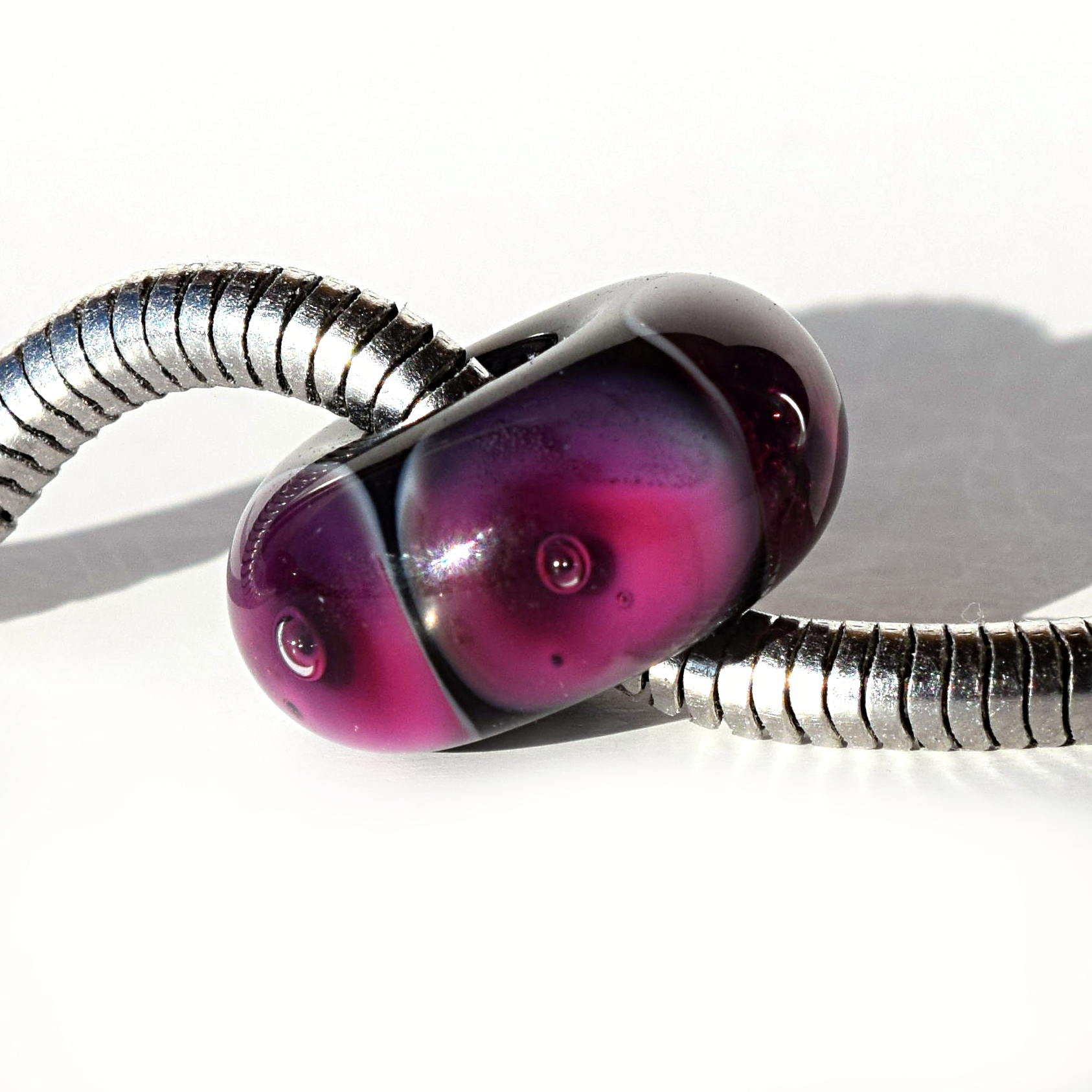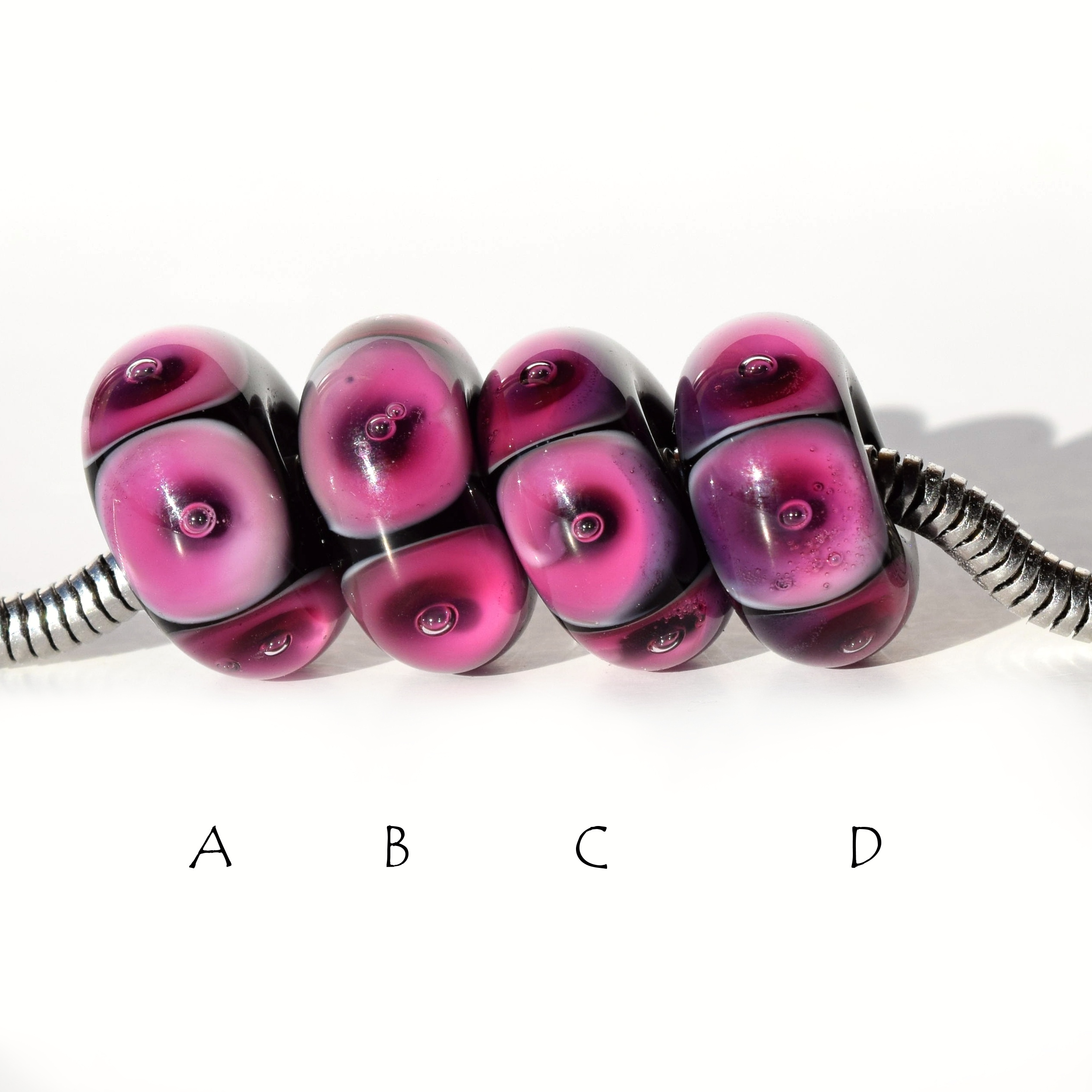Studánky růžového a fialového skla s bublinkou na černé vinuté perličce pro Váš náramek.