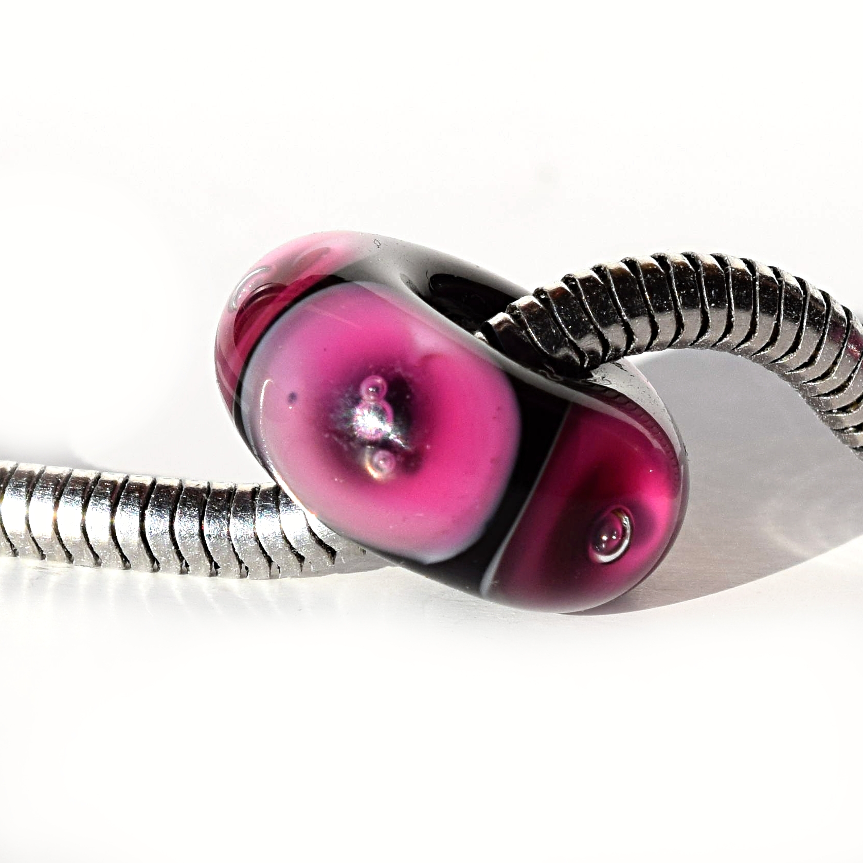Studánky růžového a fialového skla s bublinkou na černé vinuté perličce pro Váš náramek.